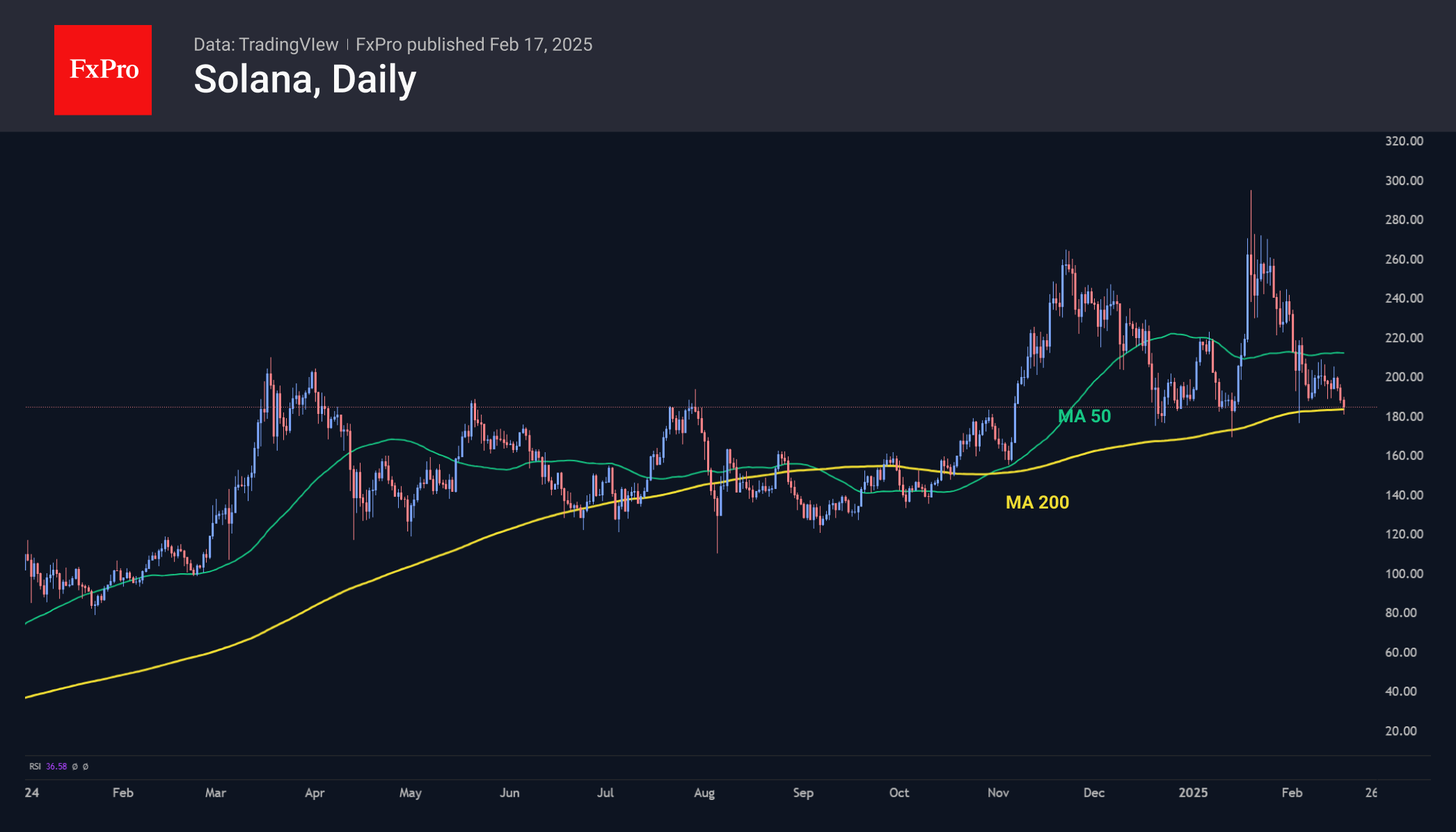 Solana в понедельник утром откатилась до $180, предпринимая попытки откатиться ниже 200-дневной скользящей средней. Вблизи этих уровней монета разворачивалась к росту в декабре и январе. Провал ниже станет вторым медвежьим сигналом для широкого крипторынка после аналогичного снижения Ethereum в начале февраля.