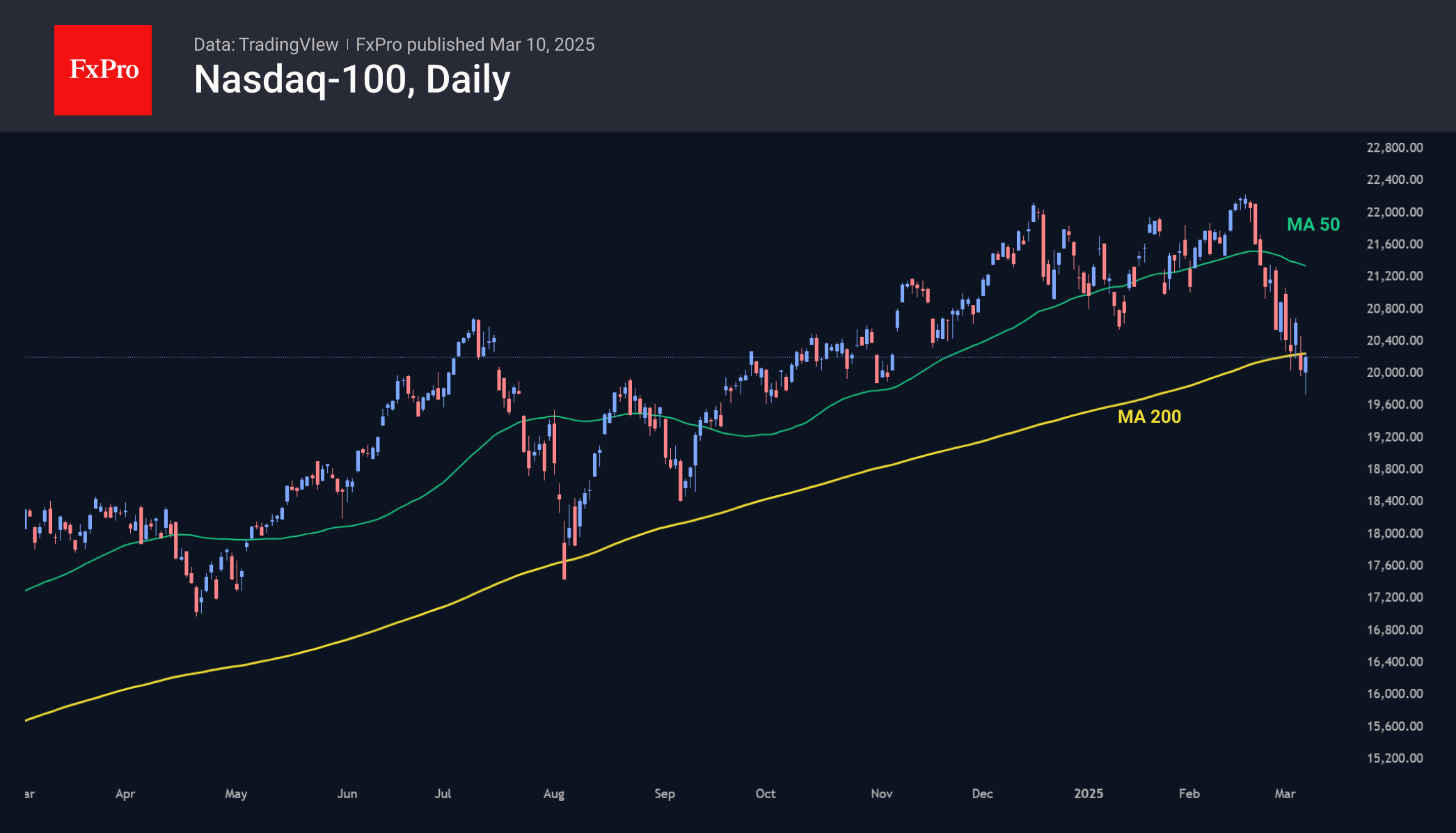 Американские индексы снижались в унисон с долларом, хотя обычно идут в обратном направлении. Но не всё так ужасно. Индексы S&P500 и Nasdaq100 получали поддержку на спадах к 200-дневной скользящей средней. Это сигнальная линия долгосрочной тенденции для многих крупных игроков. Провал под неё может означать смену режима для акций от «покупки на спадах» до «продажи на росте».