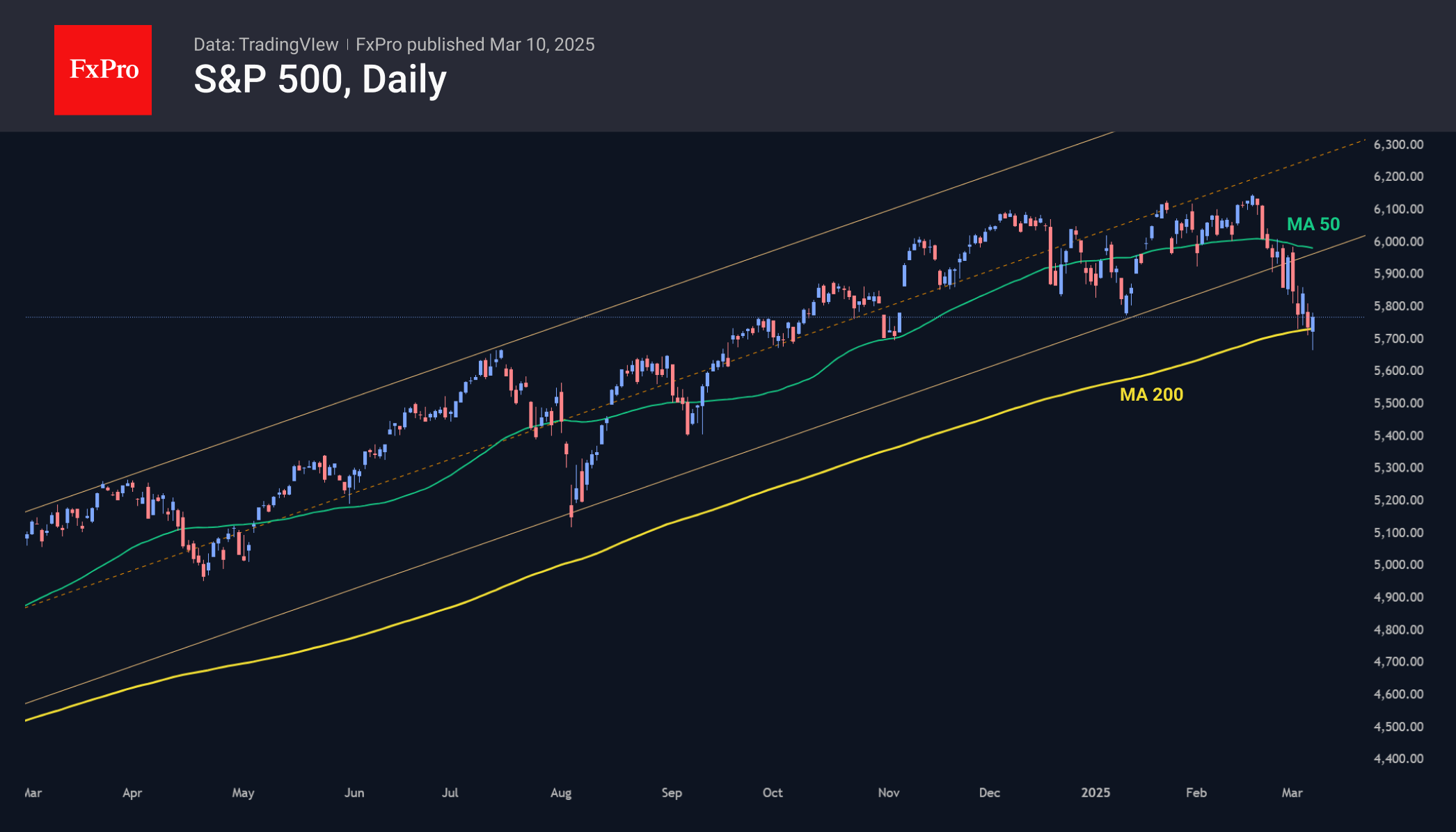 S&P500 уже сломил полуторалетнюю тенденции роста и опасно обосновался на уровнях чуть ниже 5800, почти ежедневно изучая решимость покупателей. Провал этой поддержки активизирует сценарий ускоренного снижения в область 5200–5300.