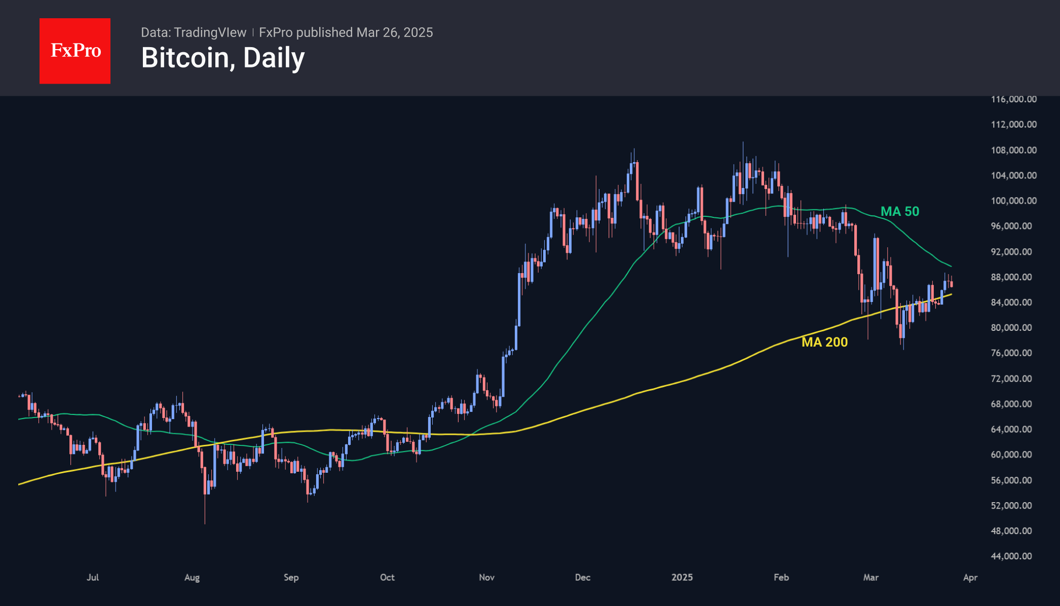 Биткоин откатился ниже $87K в среду, не решившись сходу штурмовать 50-дневную скользящую среднюю и круглый уровень $90K. Эта кривая направлена вниз и вскоре пересечёт 200-дневную среднюю. Формально, это будет "крестом смерти", но фактически больше веса в этой тенденции мы придаём повышательной тенденции цены последние три недели.