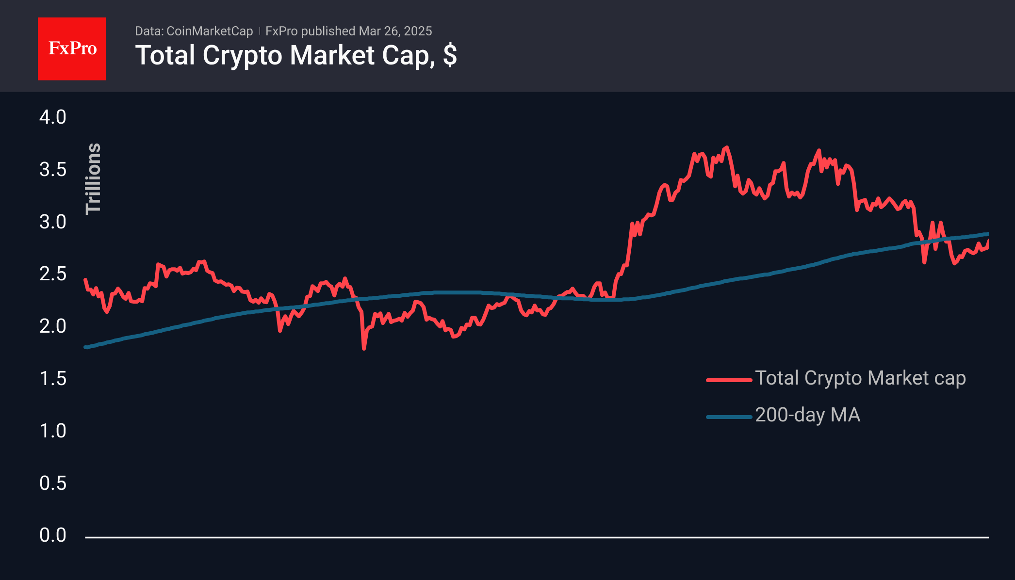 Капитализация крипторынка выросла на 0.5% за последние 24 часа до $2.89 трлн., став максимальной с 8 марта, но по-прежнему ниже 200-дневной скользящей средней. Быкам всё ещё предстоит доказать свою силу с преодолением важного технического уровня. Настораживает, последние дни движение происходит на низких объёмах. Возможно, что мы видим лишь аккуратный сбор ликвидности, чтобы обрушить рынок следующим ударом.