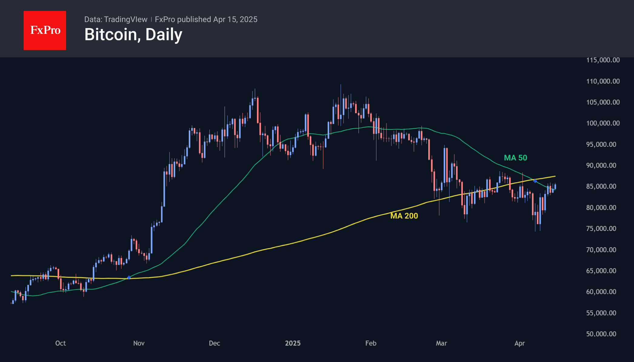 Биткоин продолжает осторожный рост, торгуясь выше 50-дневной скользящей средней и достигнув $85.7K. Это технически важная попытка переломить нисходящий тренд. Интересно, что 200-дневная средняя находится совсем близко, поэтому второе подтверждение смены тренда может прийти довольно быстро. Однако с пессимистичной точки зрения стоит отметить, что