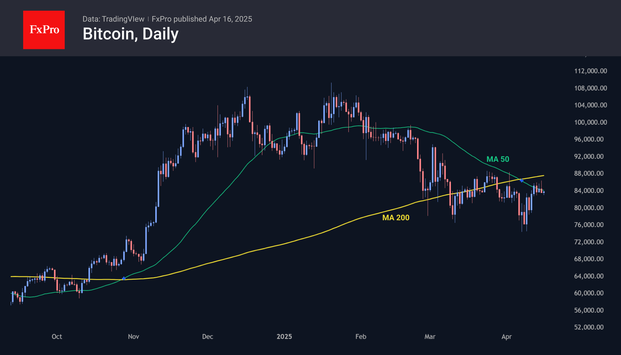 Биткоин теряет вместе с рынком, столкнувшись с сопротивлением в виде скопления 50- и 200-дневных скользящих средних. Важность этих уровней предполагает некоторую паузу в движении, но шансы на восстановление роста остаются высокими. Нижняя точка в начале апреля была более чем на 30% ниже исторических пиков, что делает текущие уровни привлекательными для долгосрочных покупателей.