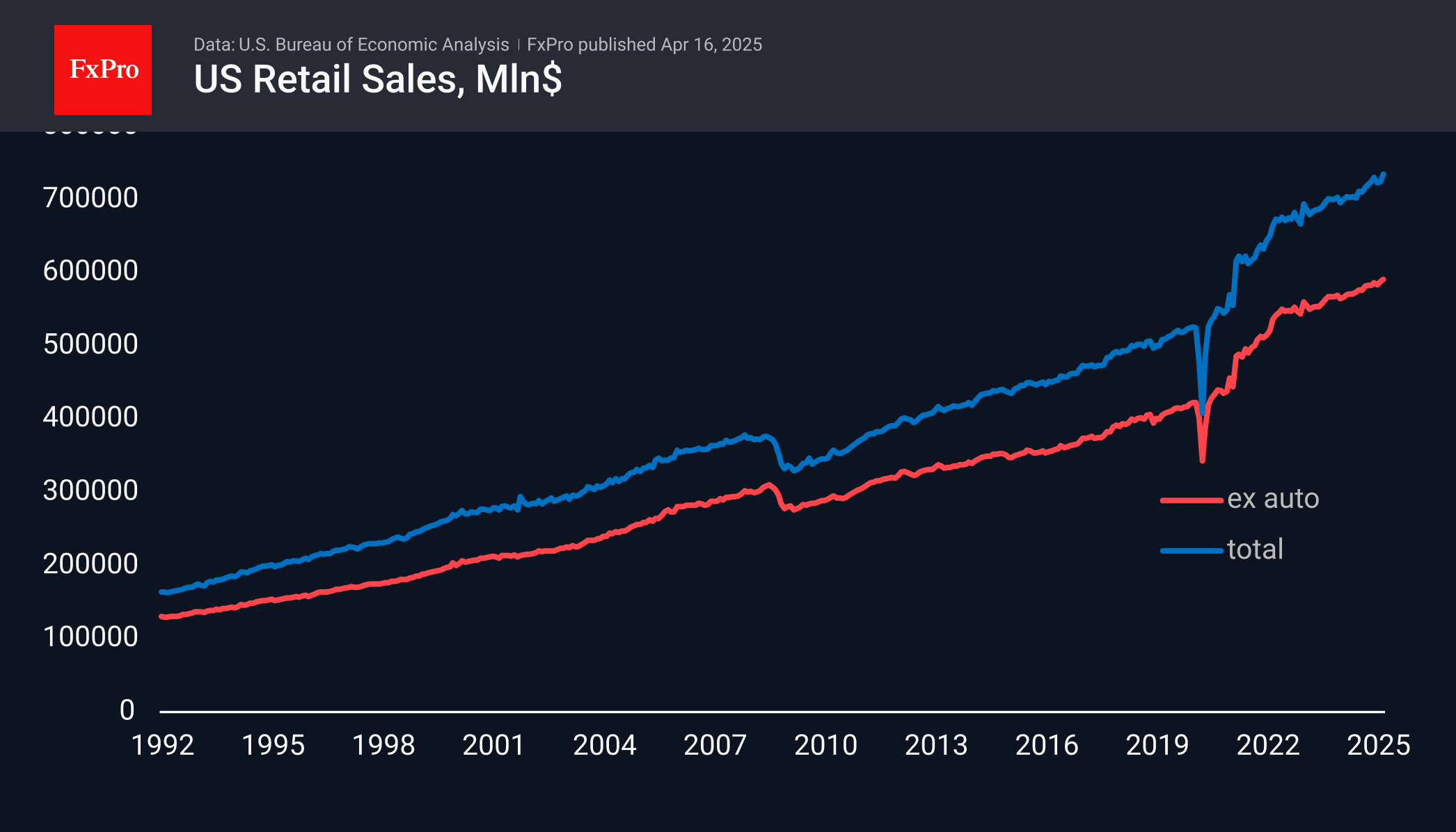 Общий рост розничных продаж в США составил 1.4% за март, превзойдя ожидаемые 1.3% после повышения на 0.2% месяцем ранее. В годовом исчислении продажи увеличились на 4.4%, что является максимальным темпом с декабря 2023 года и контрастирует с замедлением инфляции до 2.4% г/г.