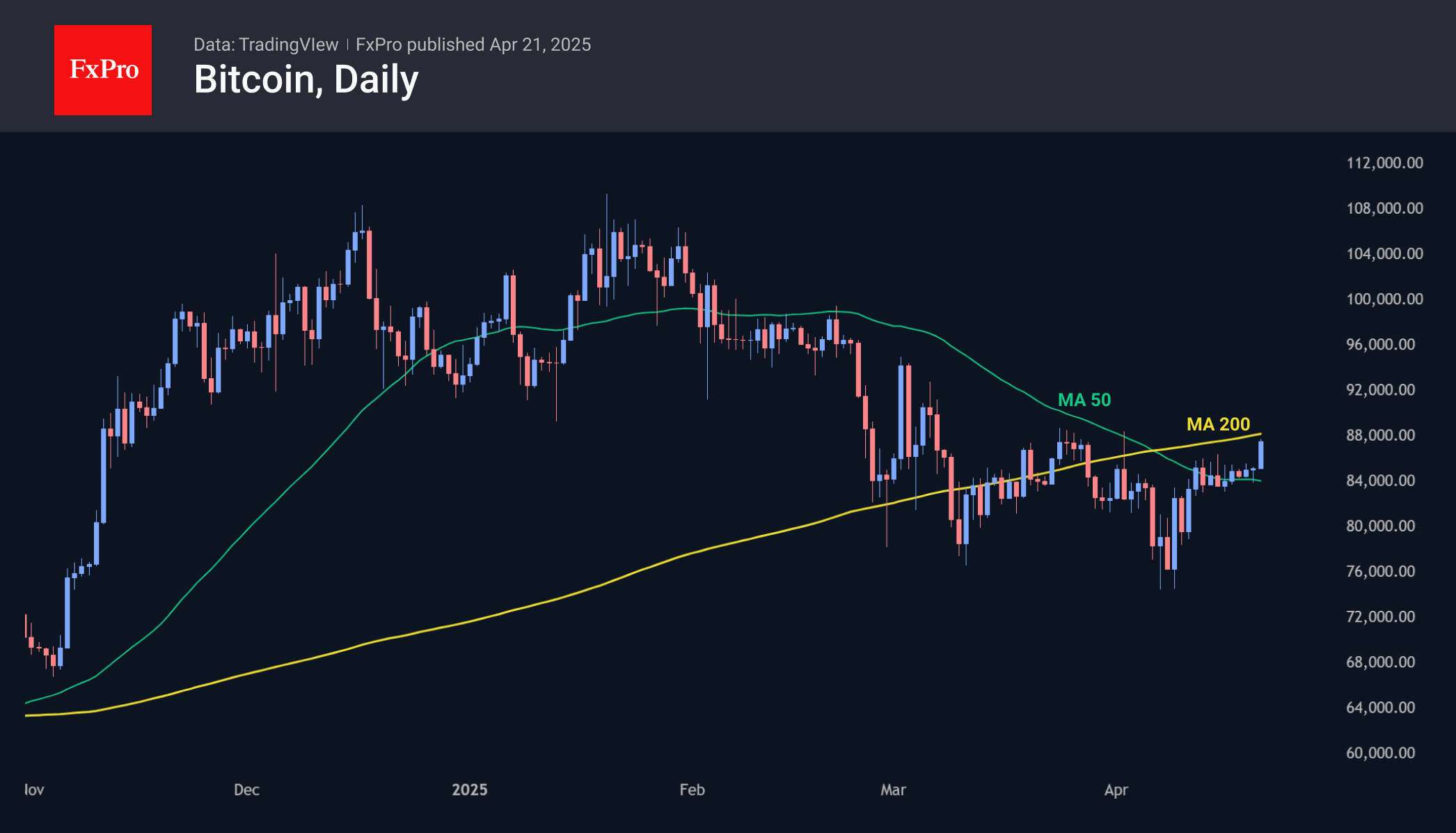 Биткоин подскочил до 87,500 в понедельник, тестируя область максимумов конца марта. Первой криптовалюте удалось оттолкнуться от 50-дневной скользящей средней, вокруг которой он крутился последние полторы недели. Закрепление над областью 88,000 станет переломом нисходящей тенденции и обеспечит возвращение в зону выше 200-дневной скользящей средней.