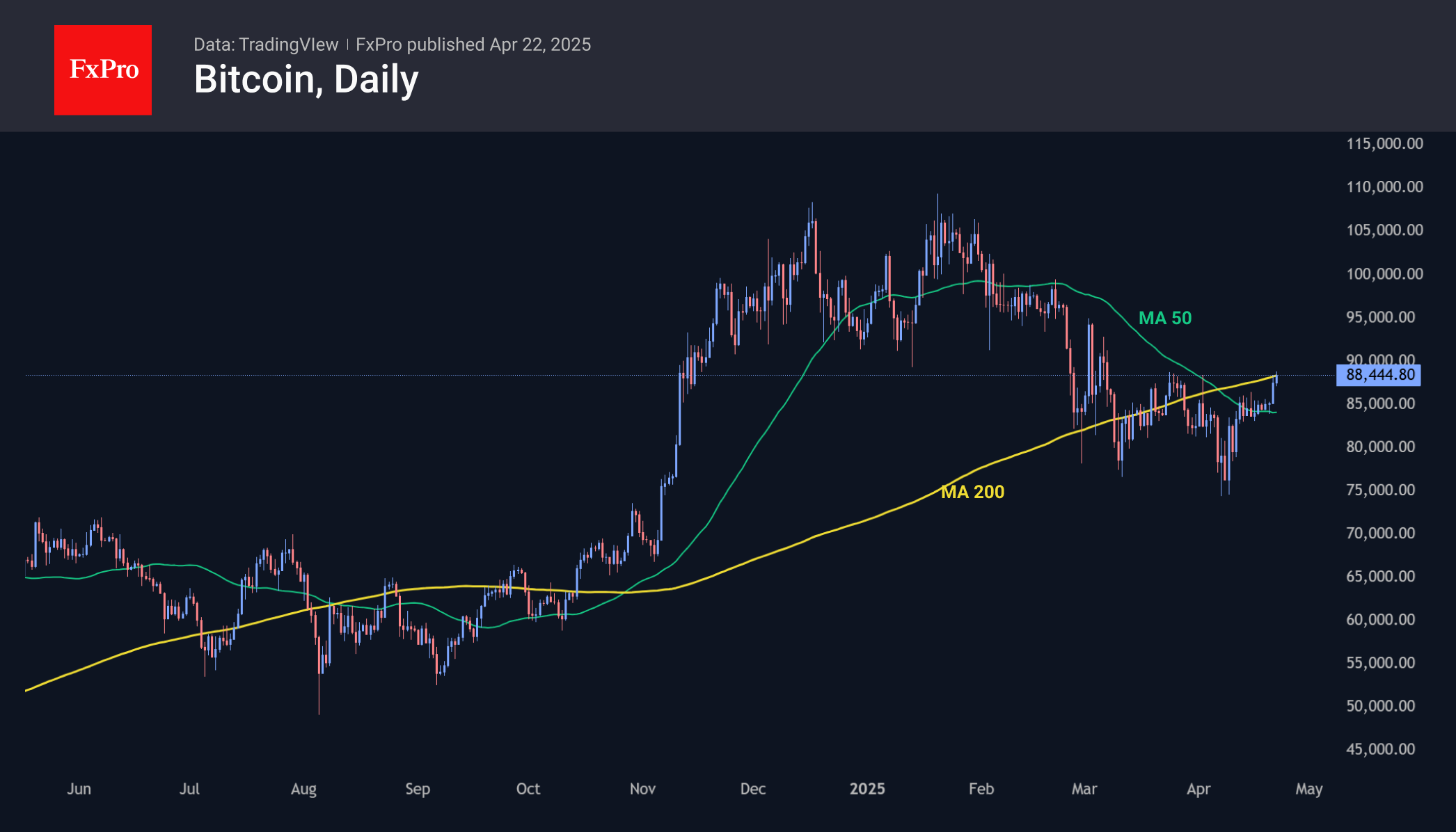 Биткоин в понедельник превысил отметку $88 000, поднявшись к максимумам почти за месяц, несмотря на снижение фондовых индексов. BTC вырос на фоне ослабления доллара и достижения золотом нового исторического максимума. Первая криптовалюта тестирует на прочность 200-дневную скользящую среднюю после сравнительно продолжительной борьбы за 50-дневную. Закрепление выше может привести к ускорению роста.