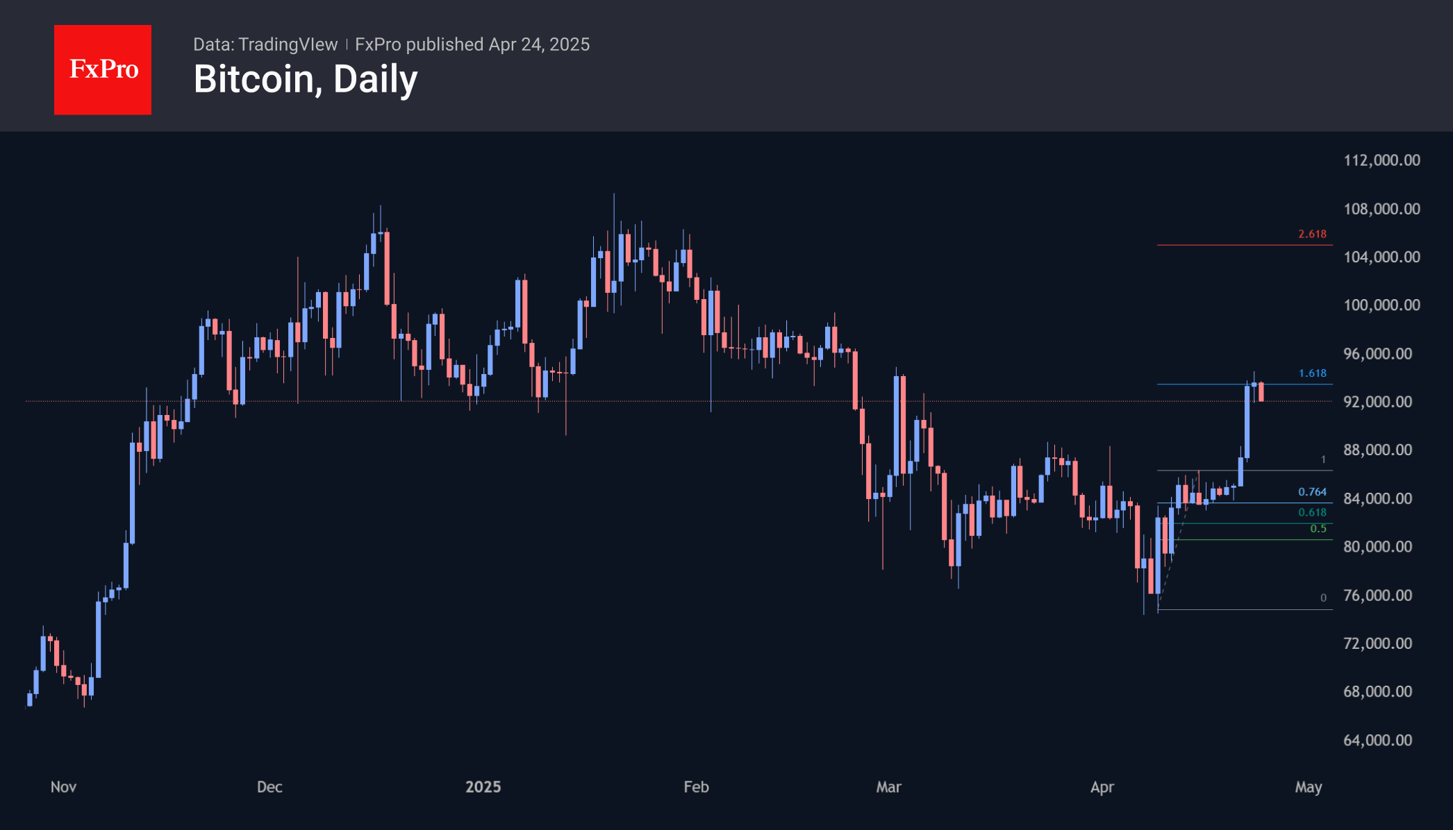 Биткоин в течение недели поднимался в район 94 тысяч, что более чем на 20 тысяч выше минимальной точки на старте апреля. Достижение последних максимумов было выходом на уровень 161.8% от первоначального отскока, красиво укладываясь в паттерн Фибоначчи. Одновременно, это предполагает новый краткосрочный этап консолидации перед рывком вверх. Техническая цель потенциального нового роста находится у 106 тысяч, что вблизи области исторических максимумов первой криптовалюты. Если модель Фибоначчи сработает, мы увидим третий тест этих уровней.