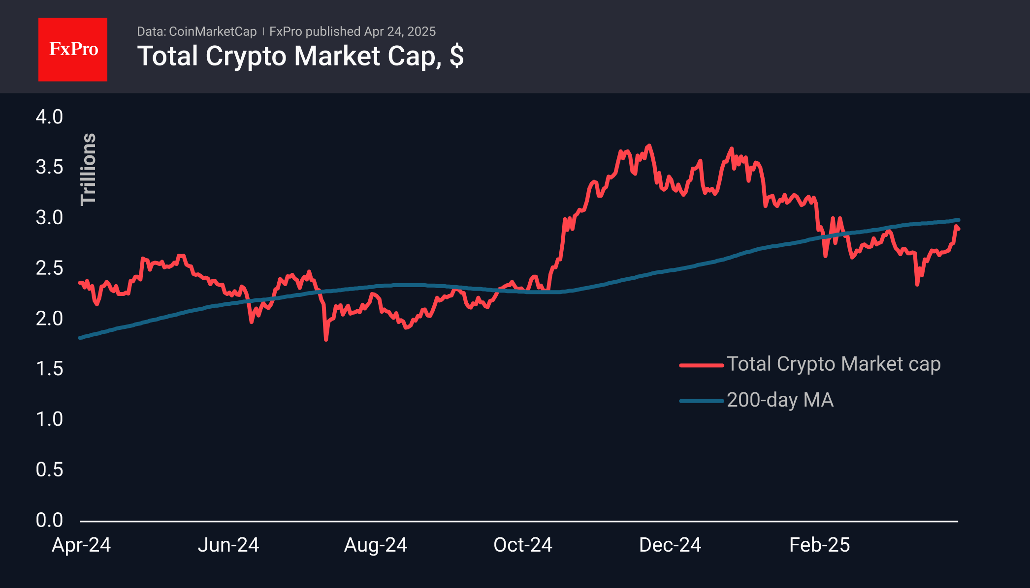 Криптовалютный рынок скорректировался примерно на 1.3% до $2.9 трлн. от пика среды, но уверенно прибавляет свыше 8.5% за последние семь дней. Рынок отскакивает от долгосрочного ключевого уровня 2.5 трлн., который ранее выступал в качестве значимой области сопротивления. Капитализация превысила последний пик, обозначив слом нисходящего сопротивления последних трёх месяцев. Это важный сигнал готовности рынка двигаться дальше вверх.