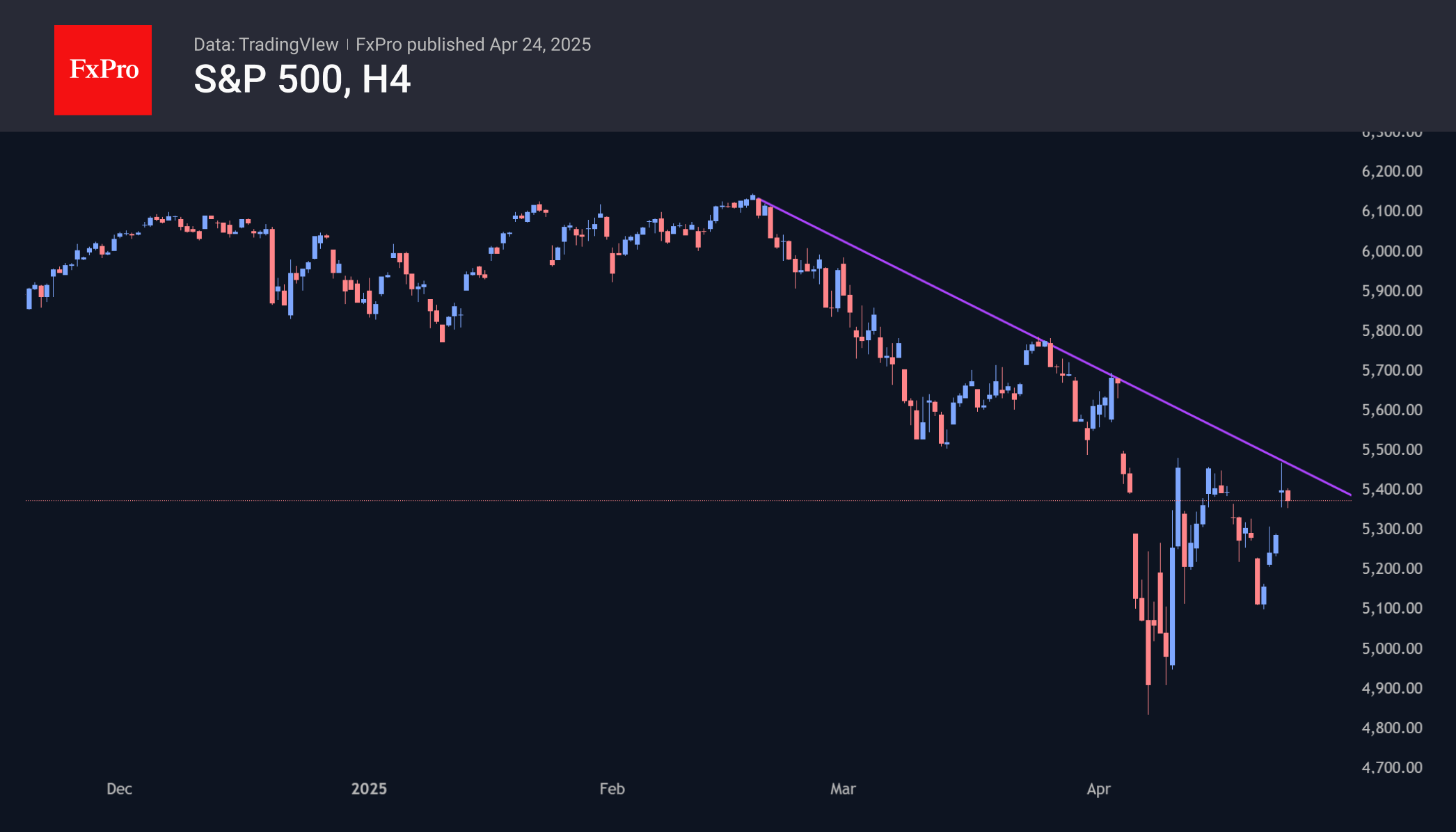 Фондовые индексы пока не могут похвастать столь же впечатляющим восстановлением, прибавляя около 2% по S&P500 с начала недели, продолжая упираться в локальное сопротивление у 5500. Индекс остаётся у линии сопротивления нисходящей тенденции, действующей с конца февраля. Если исключить политику, то более выигрышно сейчас быть на стороне быков, так как рынок восстанавливается после коррекции.