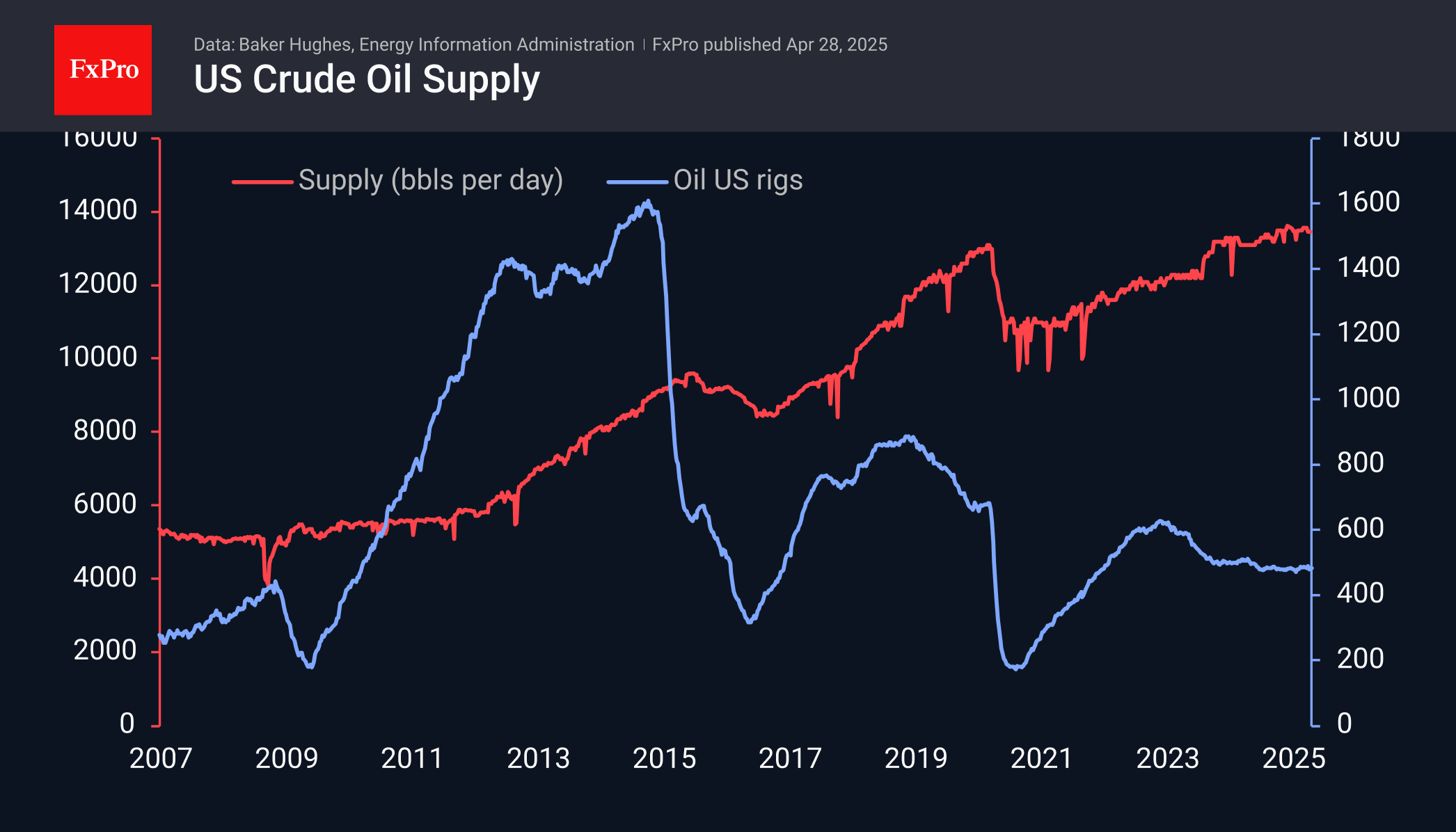 В начале апреля нефть обрушилась на сочетании страхов перед глобальным замедлением из-за тарифов (меньше спроса) и намерением ОПЕК+ повысить добычу (больше предложения). Однако в последние три недели мы видели тенденцию плавного восстановления, позволившую отыграть примерно половину изначального спада.