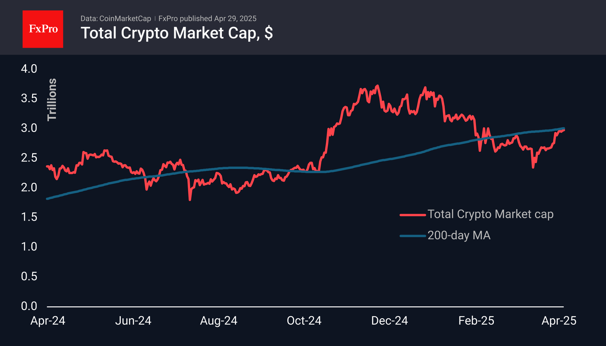 Капитализация крипторынка выросла на 7.5% за прошедшие семь дней, стабилизировавшись на подходе к отметке $3 трлн. Это важная консолидация сил перед значимым порогом в виде 200-дневной скользящей средней. Преодоление этой линии привлечёт крупные активные фонды, для которых она является важным ориентиром. Уверенное возвращение на территорию выше $3 трлн способно заметно усилить активность покупателей.