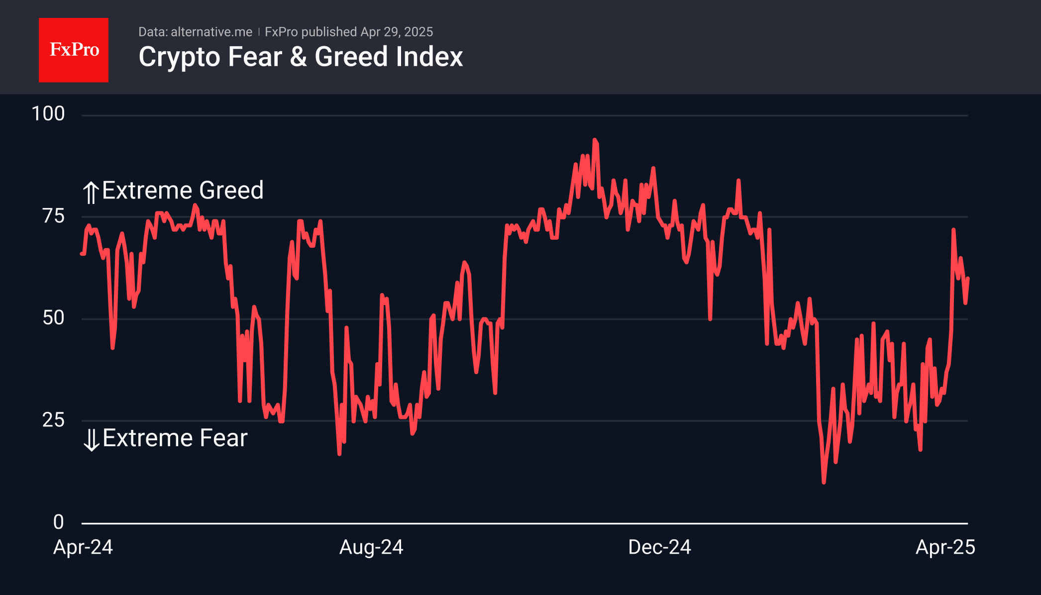 В течение недели криптовалютный индекс страха и жадности вышел с территории страха и пытается закрепиться в жадности с последним значением на уровне 60. С конца февраля по середину прошлой недели индекс не превышал 50. Рост от экстремально низких уровней, как правило, предвещает дальнейшее повышение.