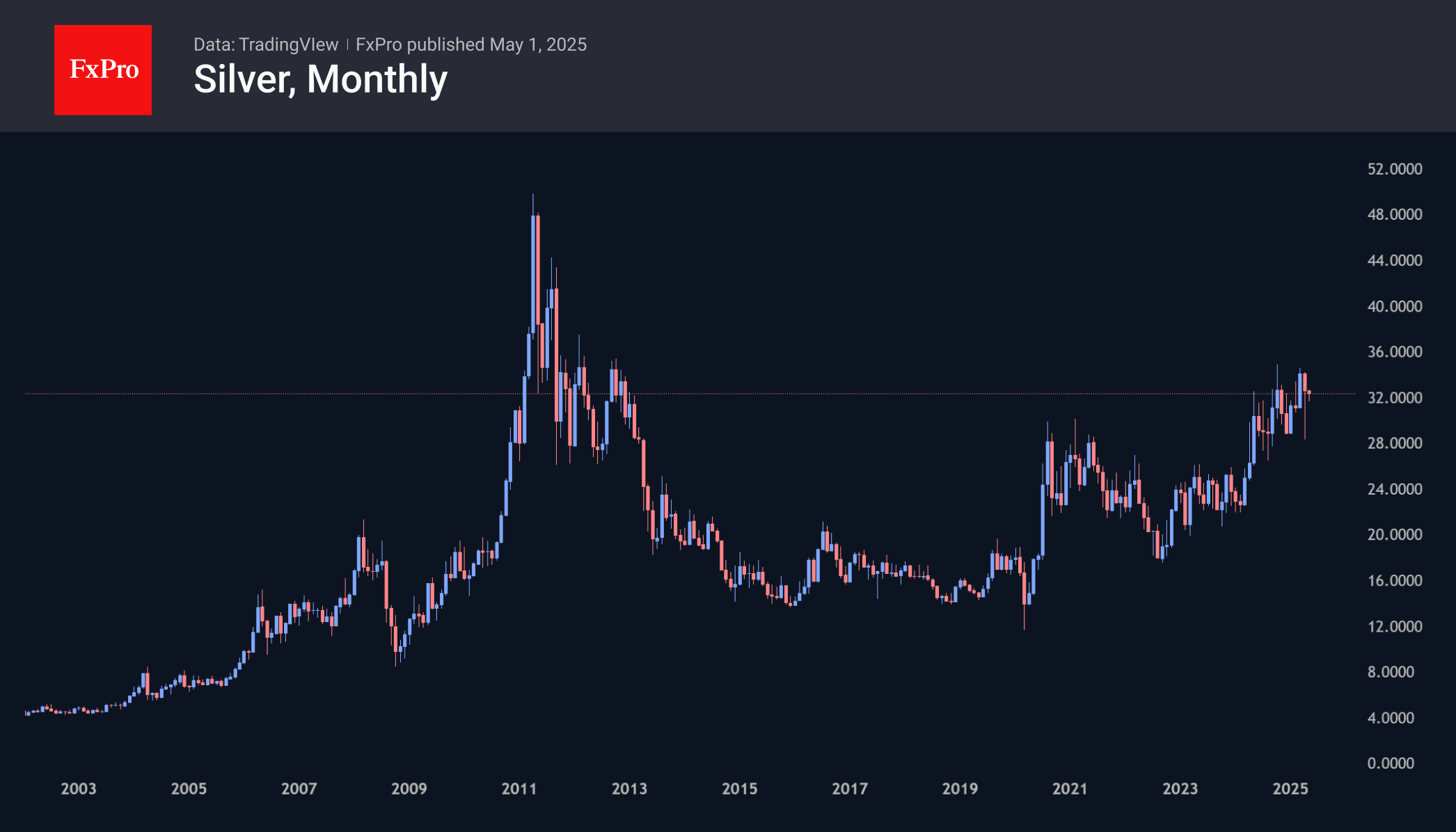 Серебру приходится нелегко из-за золота и близости собственной исторической поворотной точки, так как на подходе к уровню 35 долларов за унцию цена разворачивалась вниз в 2012 году и 2024. А в промежутке между этими датами была сильно ниже. То есть сильное внутреннее сопротивление совпало с усталостью золота от роста. Однако, то, как серебро выкупали на провале в апреле заставляет сохранять позитивный взгляд не только на этот металл, но и на золото.