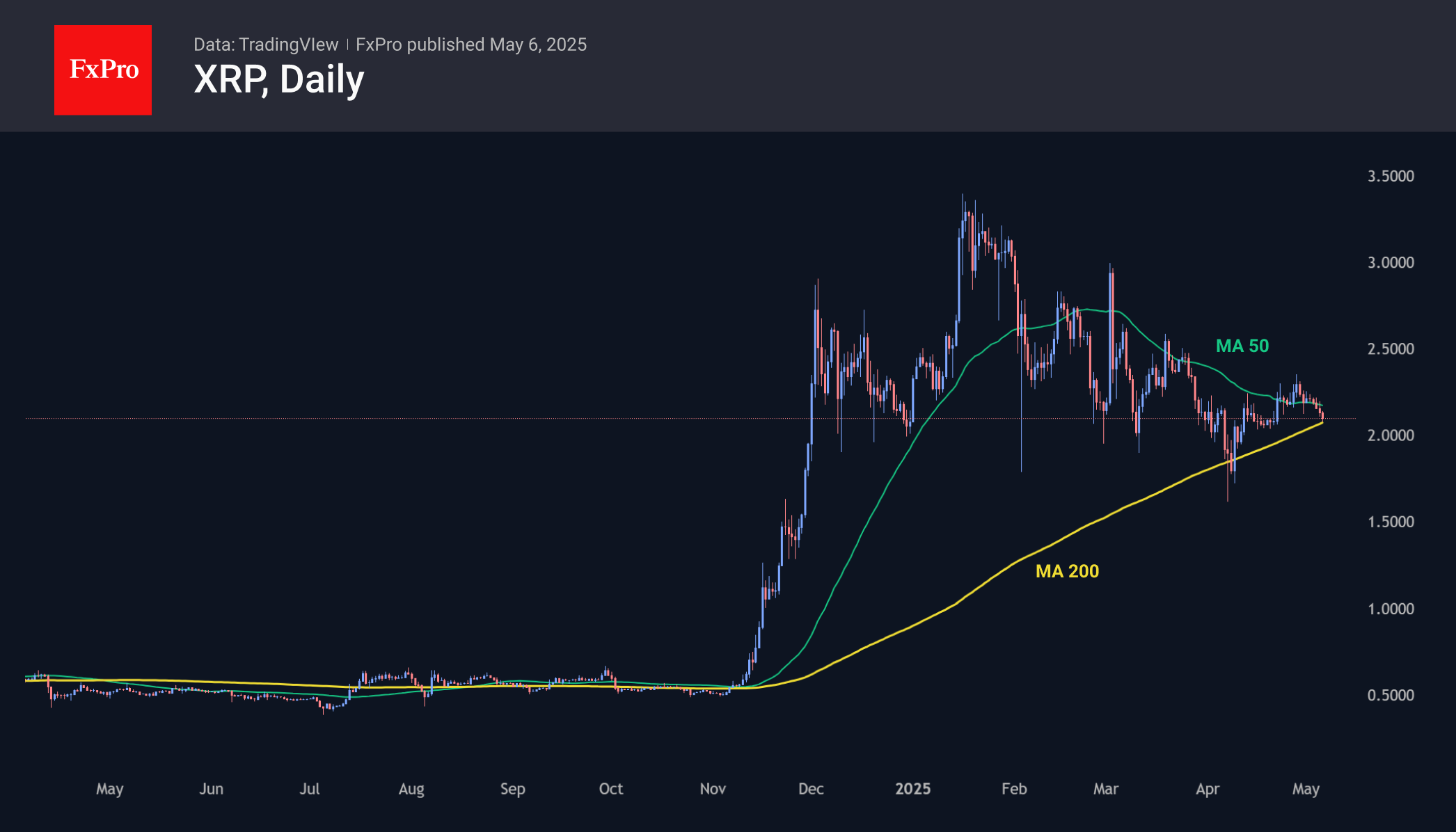 XRP пропустил значительную часть ралли криптовалют в конце апреля, и ему так и не удалось оторваться от своих 200- и 50-дневной скользящих средних. При цене 2.09 XRP проторговывает важную поддержку последних месяцев, заставляя внимательно смотреть за направлением прорыва, так как это откроет путь к изменению цены на 50% от текущей. Это огромный потенциал.