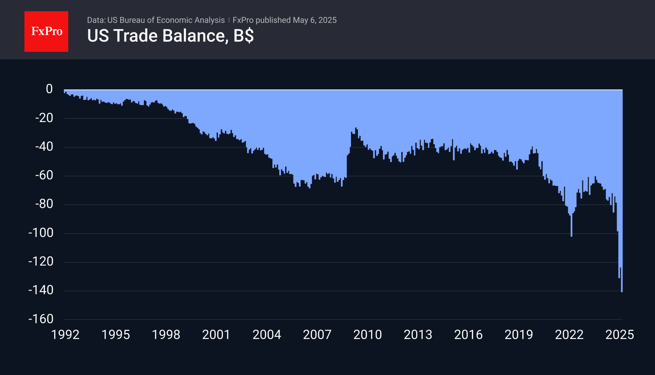 Торговый дефицит США с другими странами взлетел до исторических высот в марте, что было попыткой купить товары до введения тарифов. Напомним, что шокирующее выступление президента США с табличкой тарифов в «день Освобождения Америки» и последующие тарифы глаз-за-глаз – это уже апрельская история.