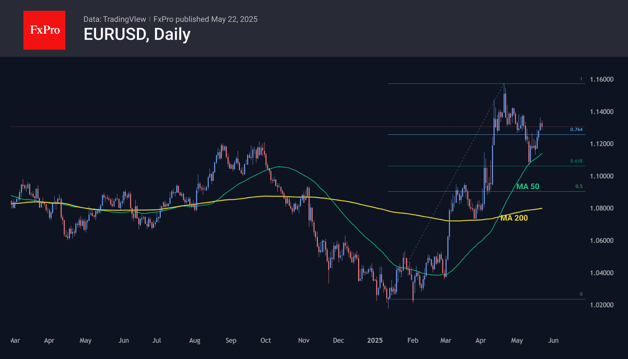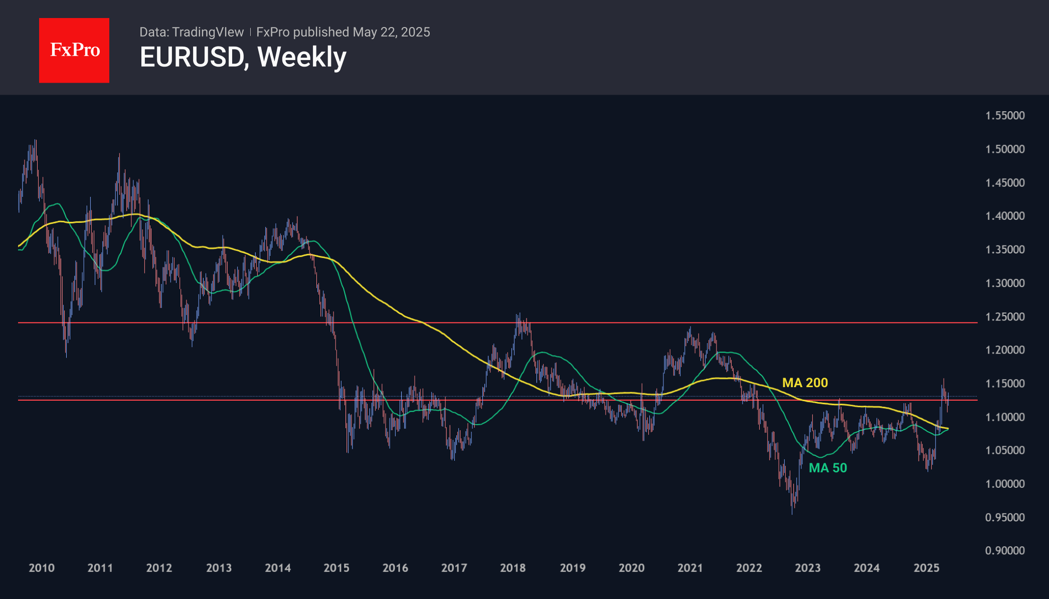 То есть, коррекционный откат EURUSD с конца апреля мог быть всего лишь тактической консолидацией сил перед дальнейшим рывком с долгосрочной целью на 1.25.