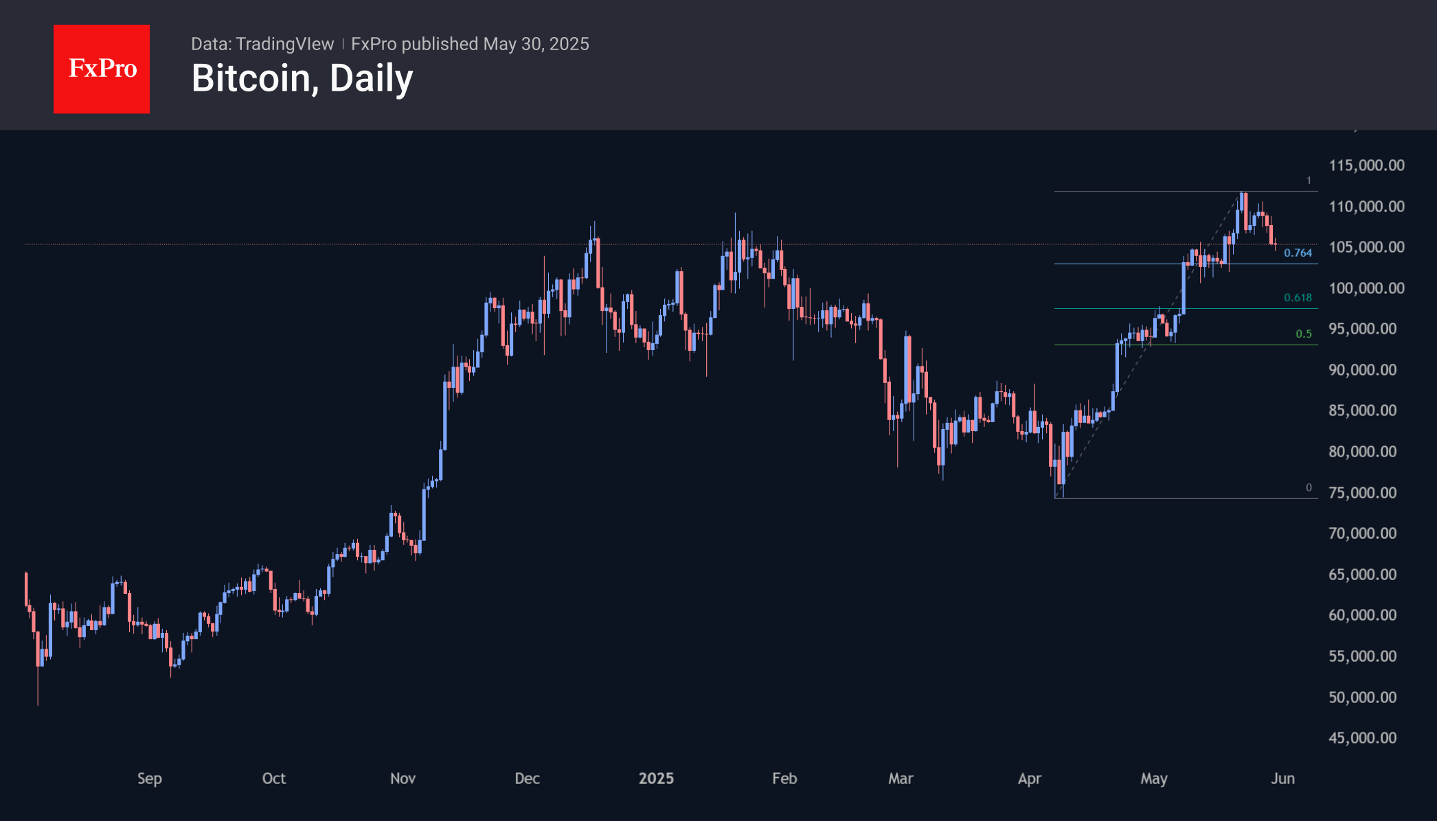 Биткоин в пятницу утром опускался до $104.7K, стабилизировавшись к началу активных европейских торгов у $106.0K, демонстрируя снижение четвёртый день. Технически, откат вплоть до $103K будет укладываться в техническую коррекцию. Даже провал к $99K будет формально удовлетворять паттерну коррекции Фибоначчи. Однако даже 103 выглядит достаточно сильной локальной поддержкой на ближайшие дни.
