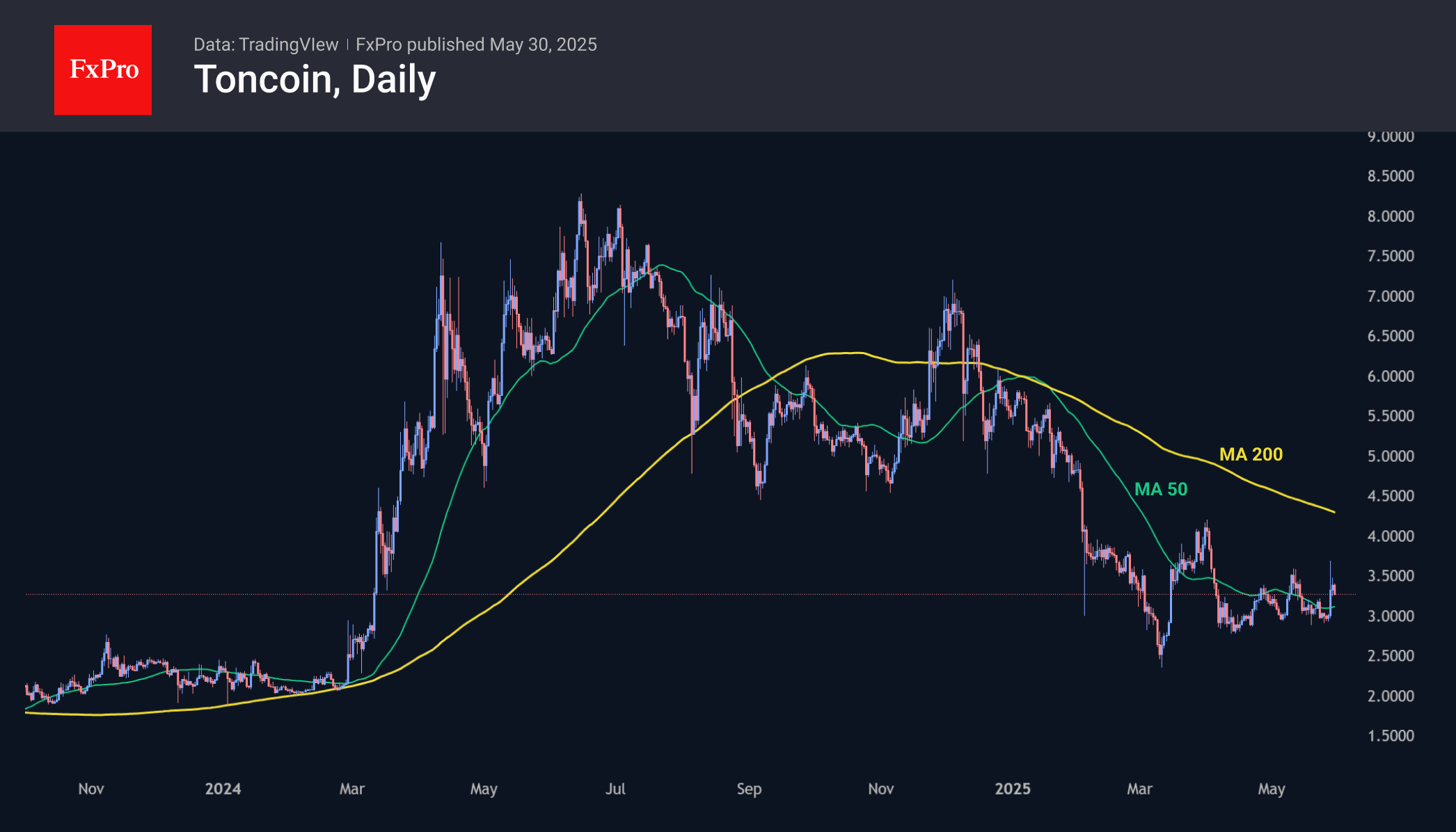 Успешное размещение облигаций Telegram позволило TON плыть против рынка, прибавляя 0.5% за день и 5% за семь дней до уровня $3.11. Это развитие отскока от многомесячных максимумов не имеет перед собой значимых препятствий вплоть до $4.20, где сочетаются пик в начале апреля и 200-дневная скользящая средняя.
