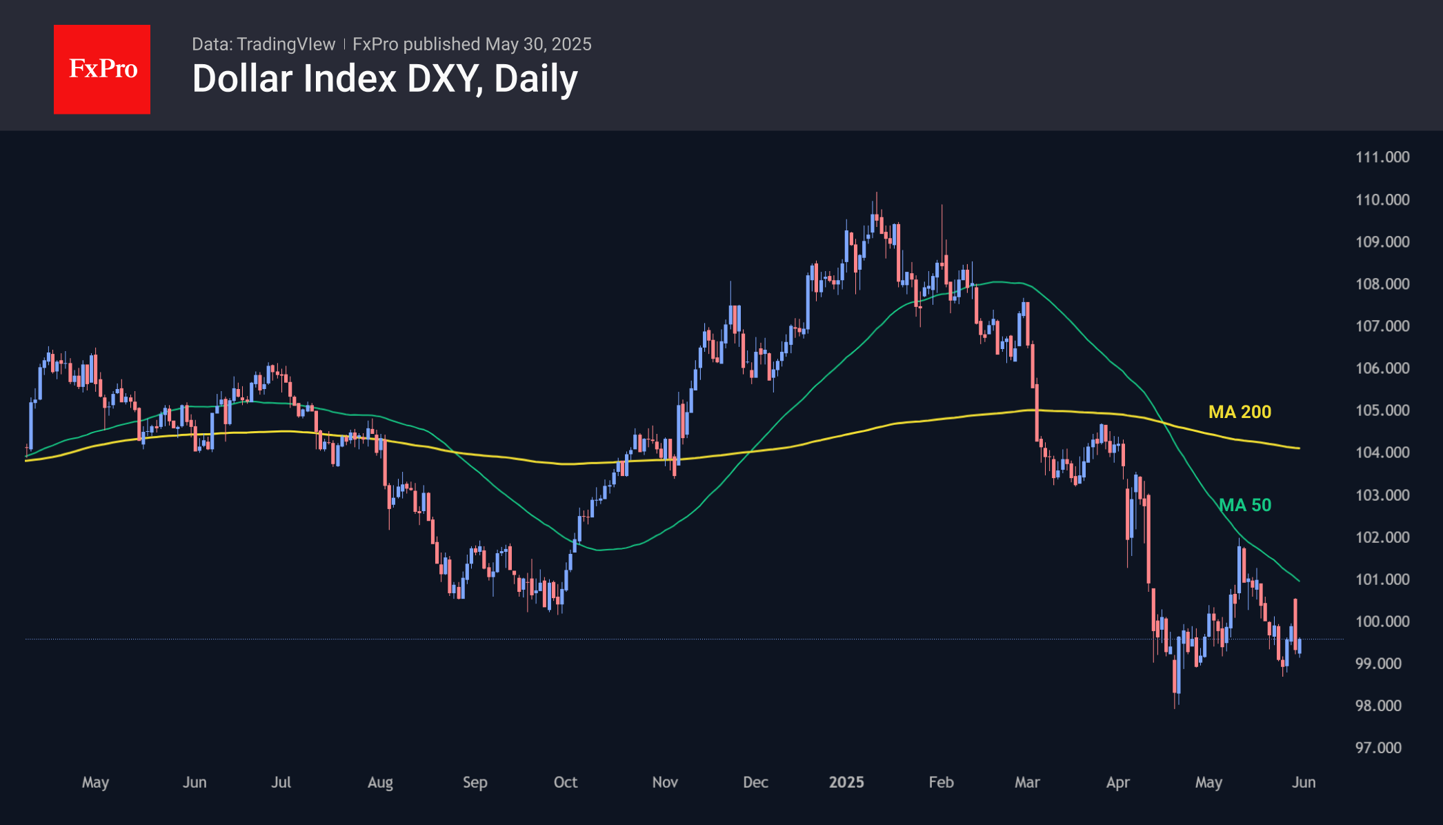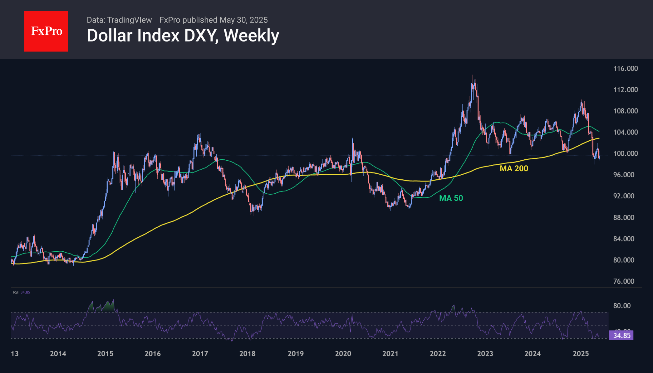 Но пока выше 50-дневной скользящей средней рынок не пошёл, натолкнувшись на решение апелляционного суда вернуть тарифы обратно на период тяжб. История подсказывает, что за отскоком после мощного снижения доллара, как правило, следует дальнейшее обновление минимумов. Поэтому стоит быть готовым к дальнейшей просадке индекса доллара до 95 (консолидация начала 2022) или даже 89–90 (поворотная область 2018 и 2021 годов).