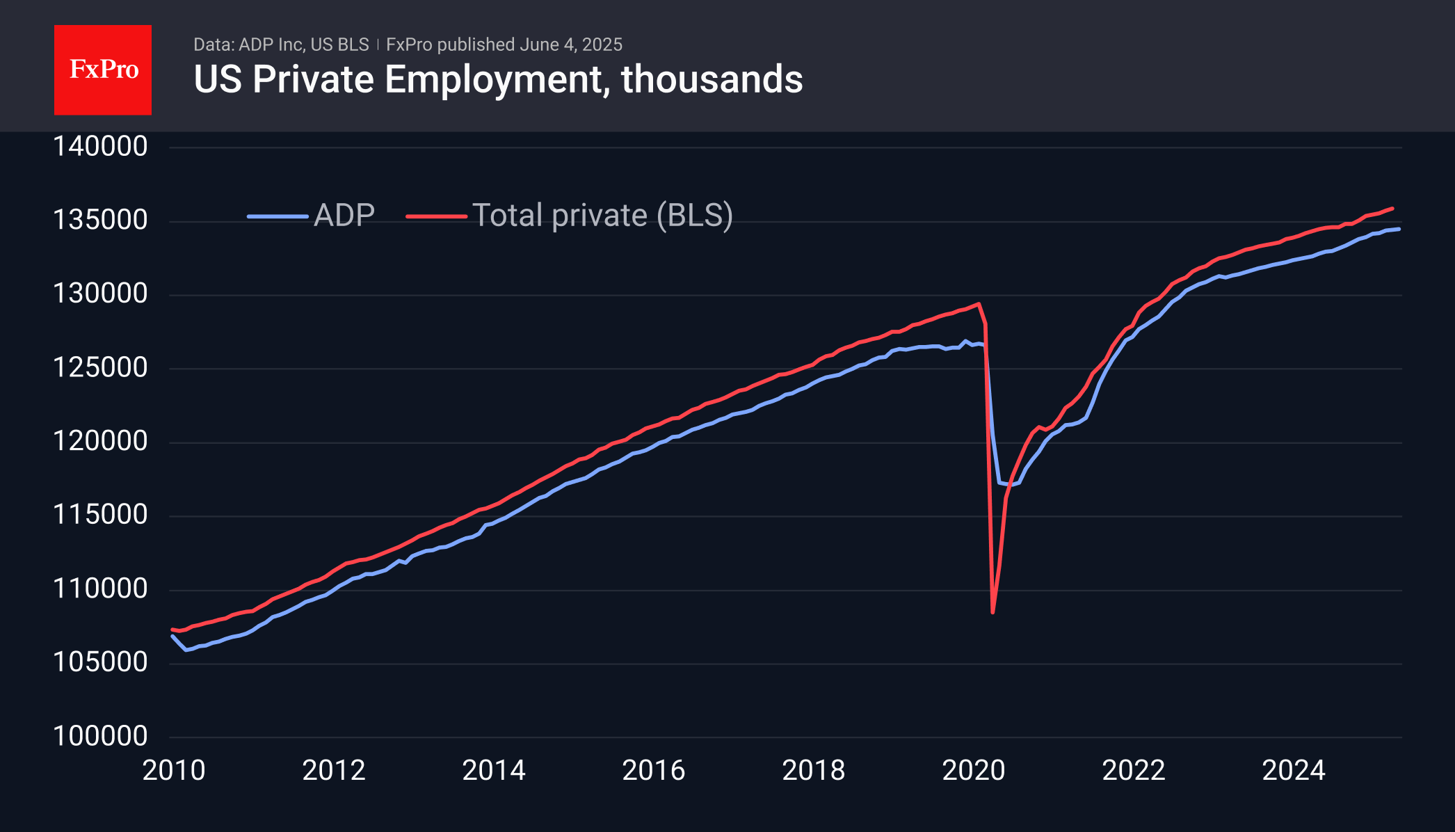 Поступающие в преддверии пятничного официального отчёта по занятости, альтернативные данные по занятости говорят о резком охлаждении. ADP сообщает о росте занятости в частно секторе на 37 тыс., минимум с марта 2023 года и сильно ниже средних значений за последние 6 и 12 месяцев вблизи 150 тыс.