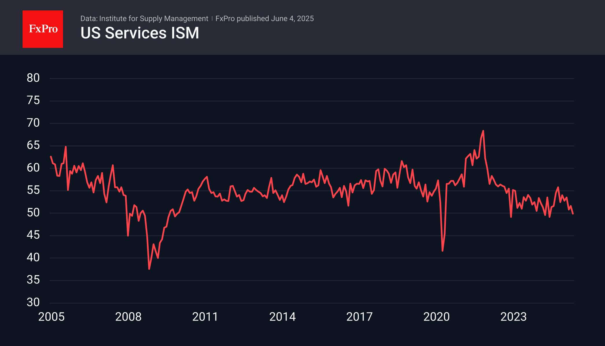 Согласно другому отчёту, сектор услуг США перешёл к сокращению в ушедшем месяце, так как индекс ISM сократился до 49.9 против 51.6 месяцем ранее. Тарифная неопределённость апреля и мая выглядит главной причиной, почему компоненты заказов тянут индекс вниз.