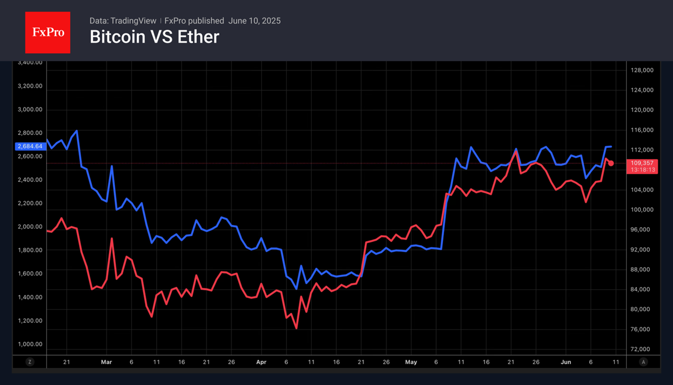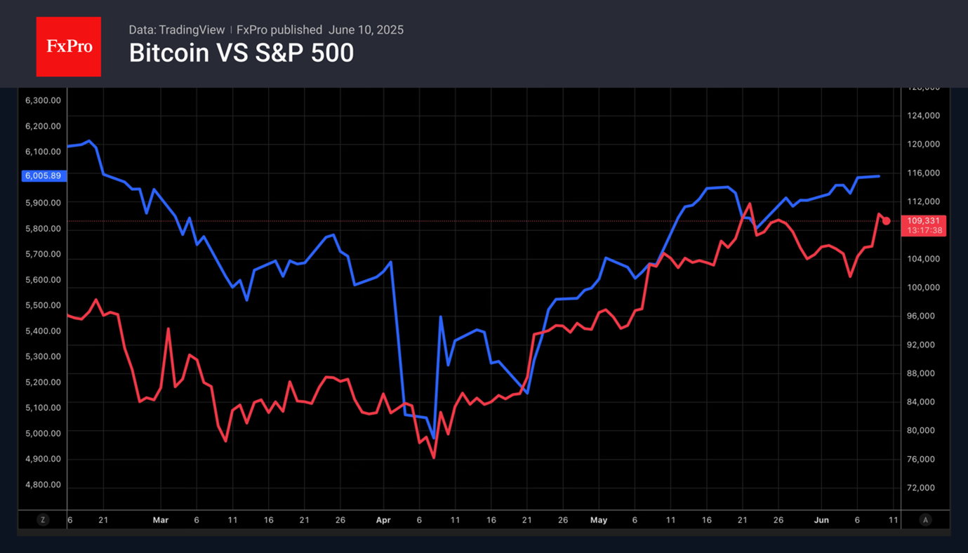 С началом июня дороги биткойна и американских фондовых индексов разошлись. S&P 500 рос на протяжении нескольких торговых сессий подряд благодаря деэскалции торговых конфликтов, силе экономики США и позитивной корпоративной отчётности. Лидер цифровых активов попал под давление из-за перетока капитала в Эфир, сомнений в эффективности нового законодательства о стейблкойнах и конфликта интересов.