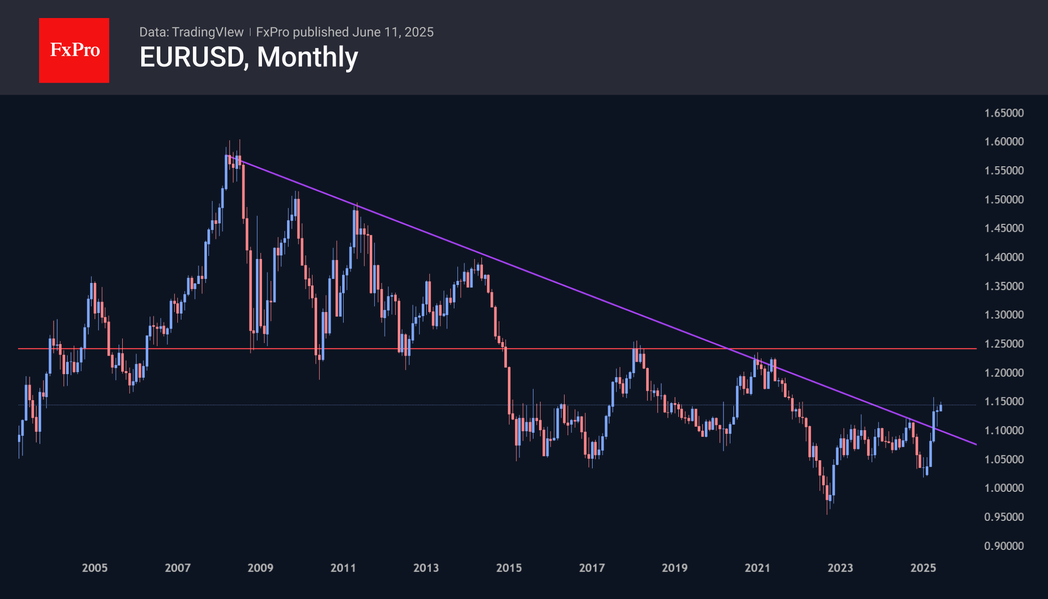 Единая валюта на протяжении месяца демонстрирует тенденцию всё более высоких локальных снижений. Импульсы роста в апреле и ранее в июне упирались в невидимый мягкий потолок на подходе к 1.15, но это выглядит лишь временной перетряской позиций после внушительного повышения и перед дальнейшим ростом.
