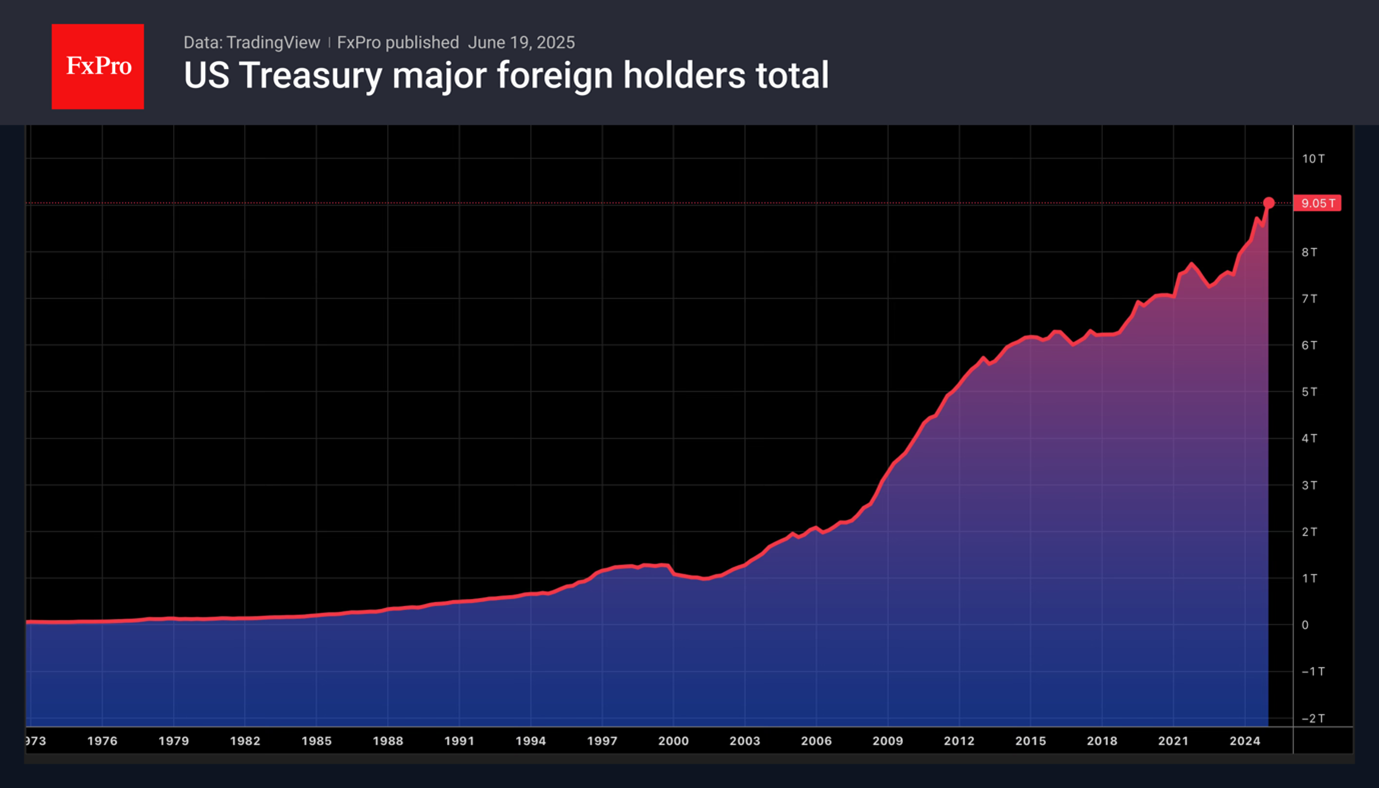 Однако стоило эпицентру потрясений для мировой экономики и финансовых рынков сместиться на Ближний Восток, как все изменилось. Доллар США вновь используют как спасительную гавань. О сохранении интереса к американской валюте говорит стабильность запасов казначейских облигаций у иностранных инвесторов. Если Китай в апреле избавлялся от трежерис, то Япония и Великобритания их, напротив, покупали.