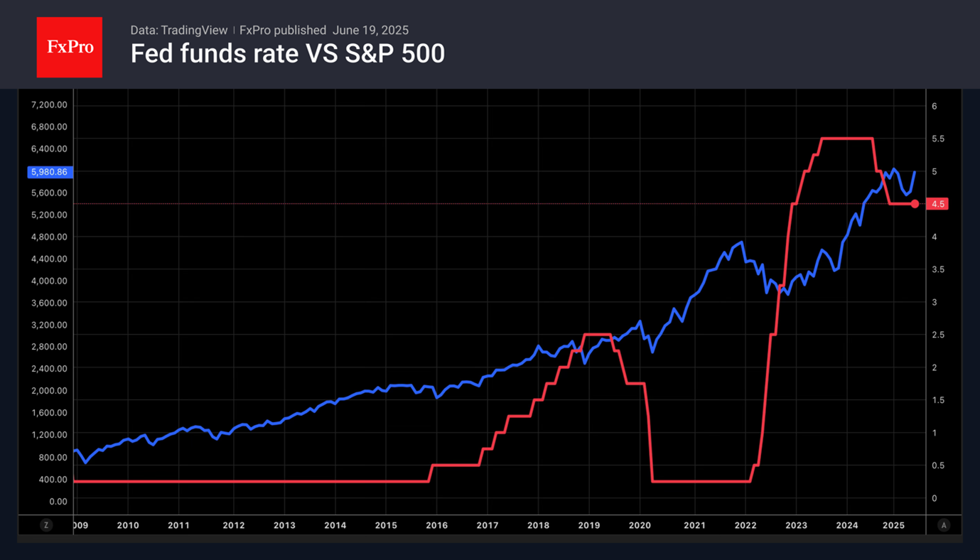 На июньском заседании ФРС нарисовала стагфляционный сценарий развития событий. Центробанк понизил прогноз по ВВП США на 2025 с 1,7% до 1,4% и повысил оценки инфляции с 2,7% до 3%. Это напугало S&P 500 больше, чем война на Ближнем Востоке и потенциальное увеличение тарифов после окончания 90-дневной отсрочки. Широкий фондовый индекс отступил, но продолжает торговаться в непосредственной близости от рекордных максимумов.