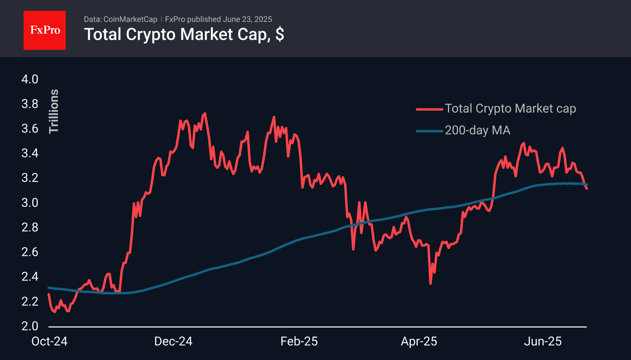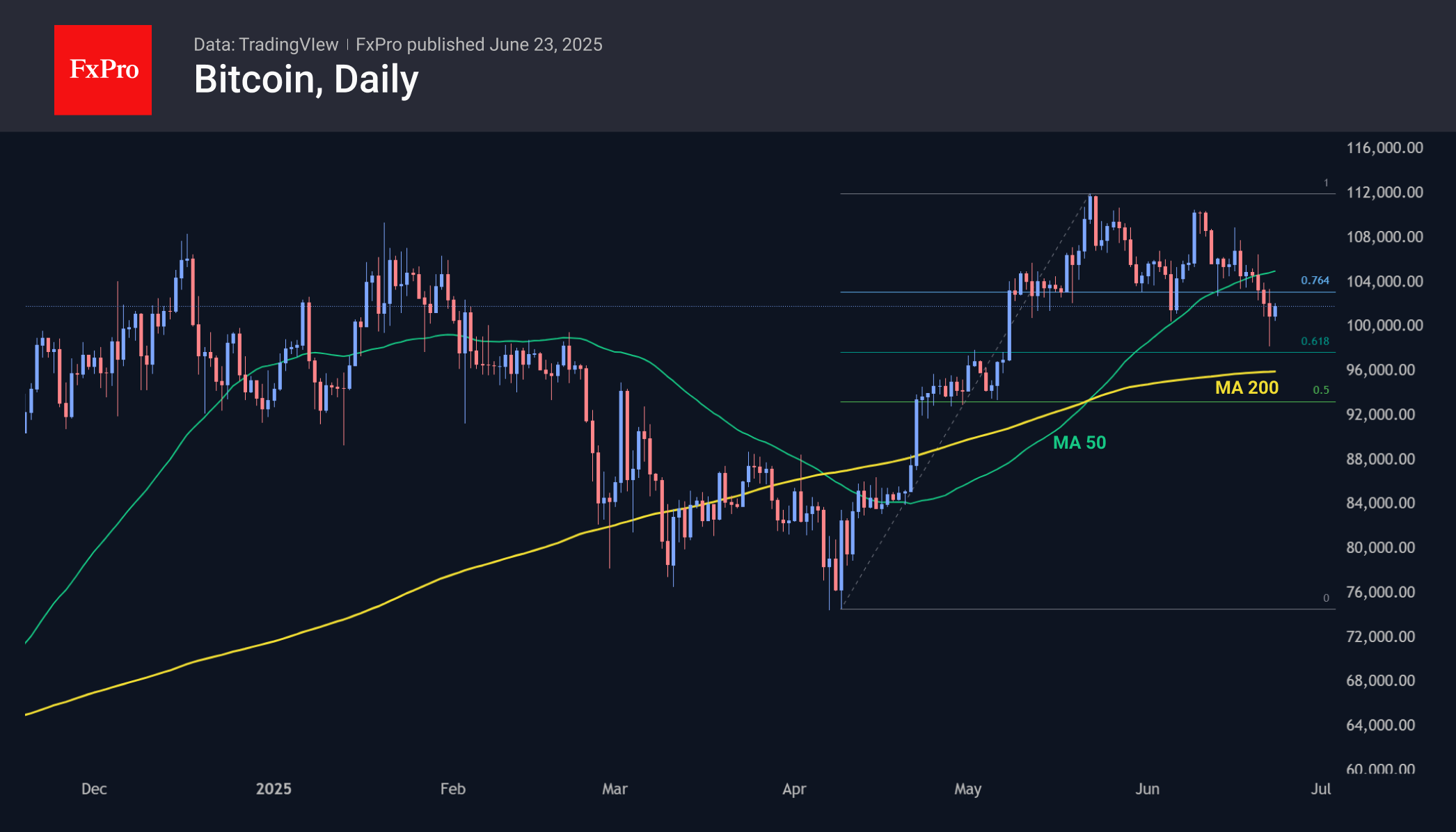 Биткоин соскальзывал до $98K на выходных. Это было касание классической поддержки в 61.8% от ралли в апреле-мае, но в начале европейской торговой сессии уже был вблизи $102K, против $102.7K в начале дня в воскресенье. Однако распродажа на прошлой неделе сломила поддержку на 50-дневной скользящей средней под тяжестью внешних обстоятельств. Выход из диапазона $96–105K заставит ждать дальнейшее движение по направлению прорыва.