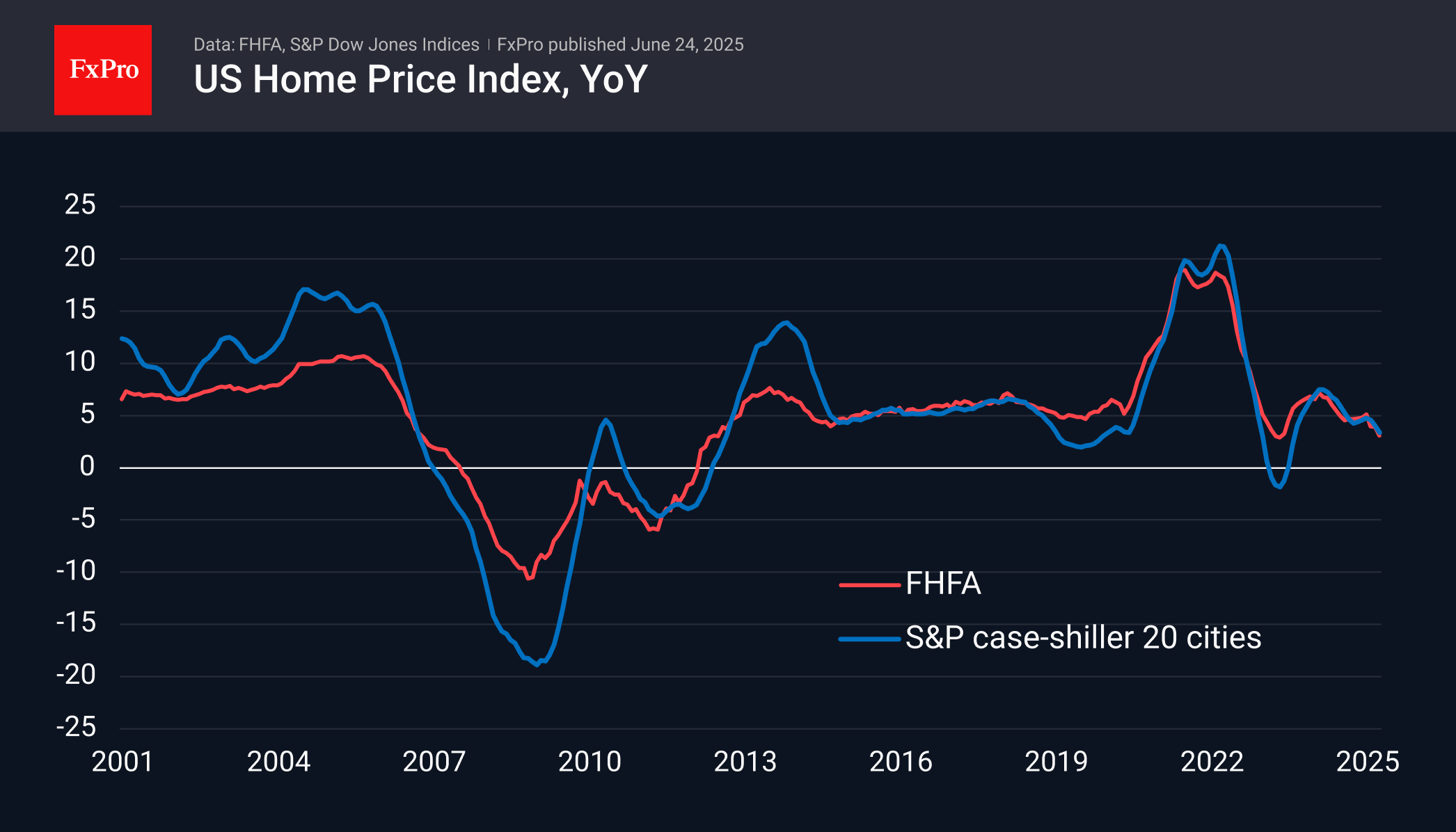 Темпы роста цен на жильё в США замедлялись в апреле, согласно запаздывающим, но широким данным от S&P Global. Годовые темпы роста цен замедлились до 3.4% г/г – минимум за почти два года. Ещё важней, что последние два месяца происходит актуальное снижение, а не просто замедление темпов роста, что указывает на охлаждение спроса.