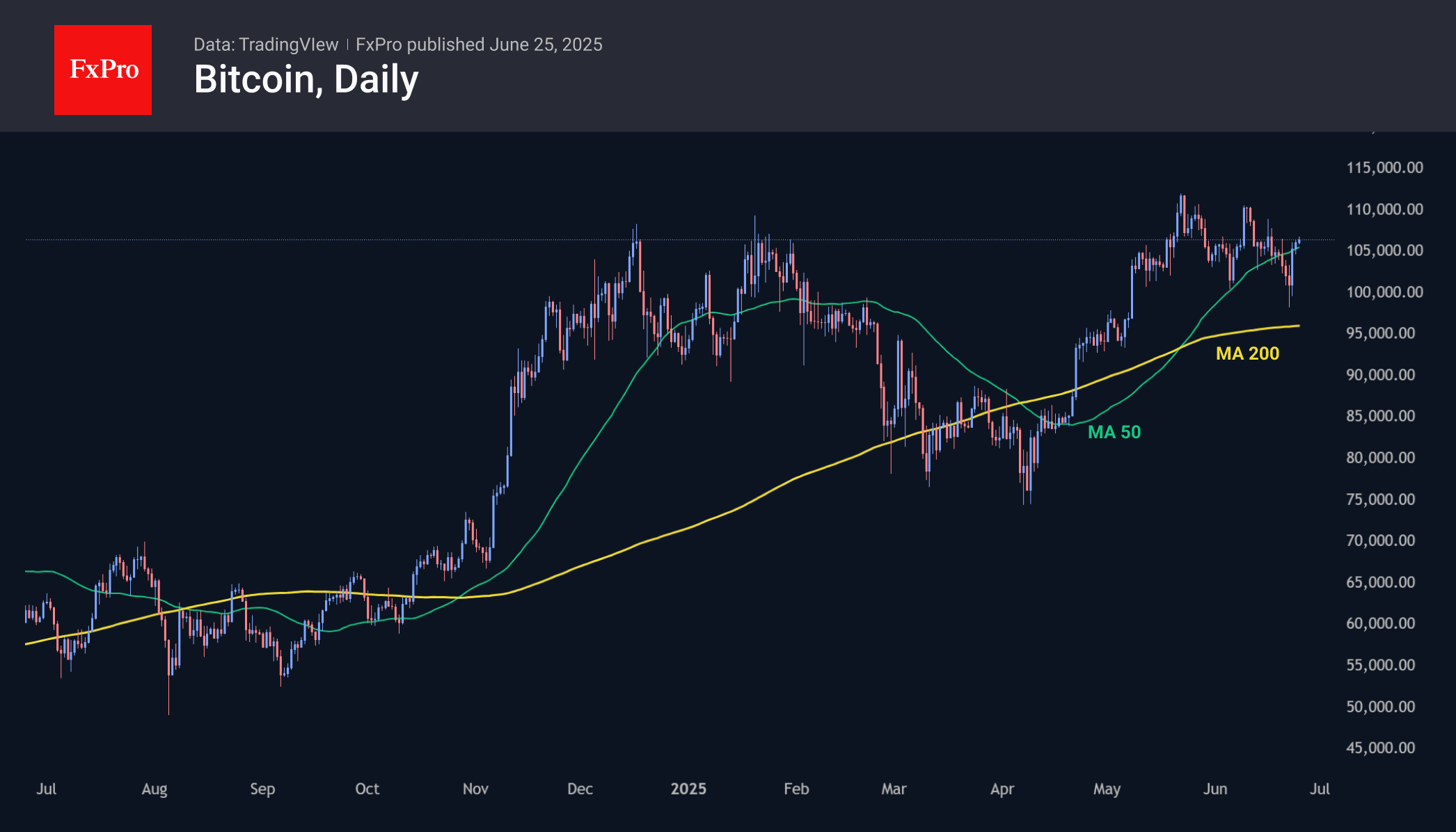 Биткоин торгуется вблизи $106K, вернувшись на территорию выше 50-дневной скользящей средней, хотя и весьма незначительно. Динамика последних трёх дней настраивает на скорый штурм максимумов. Тем не менее, оставаясь почти на 5% ниже пика, флагманская криптовалюта ведёт себя осторожней Nasdaq100, который во вторник вечером обновил исторические максимумы.