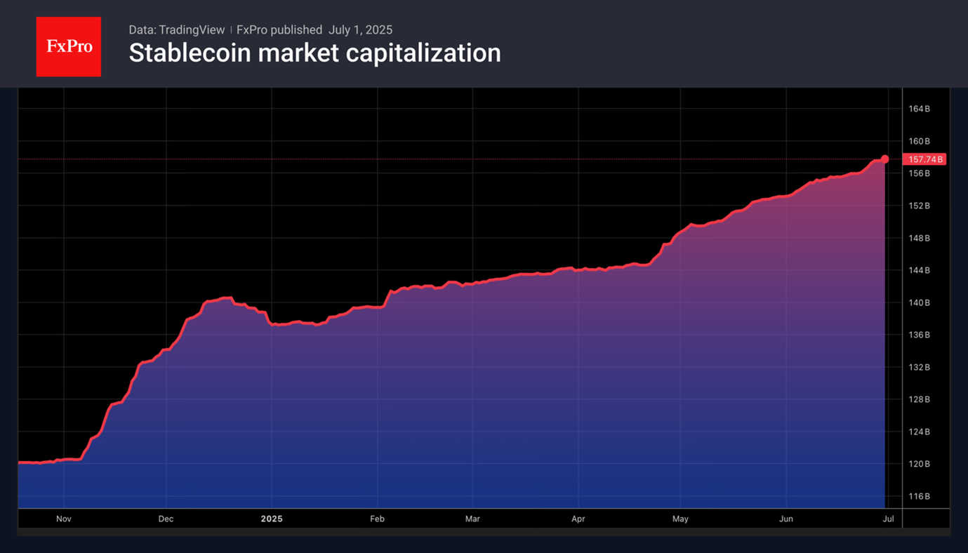 Конкуренцию биткойну в состоянии составить разве что стейблкойны. Принятие Конгрессом регулирующего их обращение законодательства повышает интерес инвесторов к этому виду цифровых активов. Только в первом полугодии капитализация рынка стабильных монет выросла на $47 млрд. Возможности их внедрения изучают не только банки, но и такие крупные компании как Amazon.