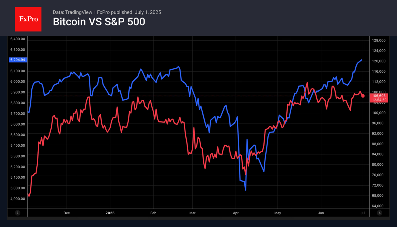 Биткойн не торопится восстанавливать корреляцию с фондовыми индексами США. S&P 500 и Nasdaq Composite в июне сумели обновить рекордные максимумы. BTCUSD этого делать не спешит. Связь между традиционным и крипторынком была нарушена во время вооруженного конфликта на Ближнем Востоке. В настоящее время лидер цифровых активов с опаской смотрит на приближение 9 июля – даты истечения 90-дневной отсрочки Белого дома по тарифам.