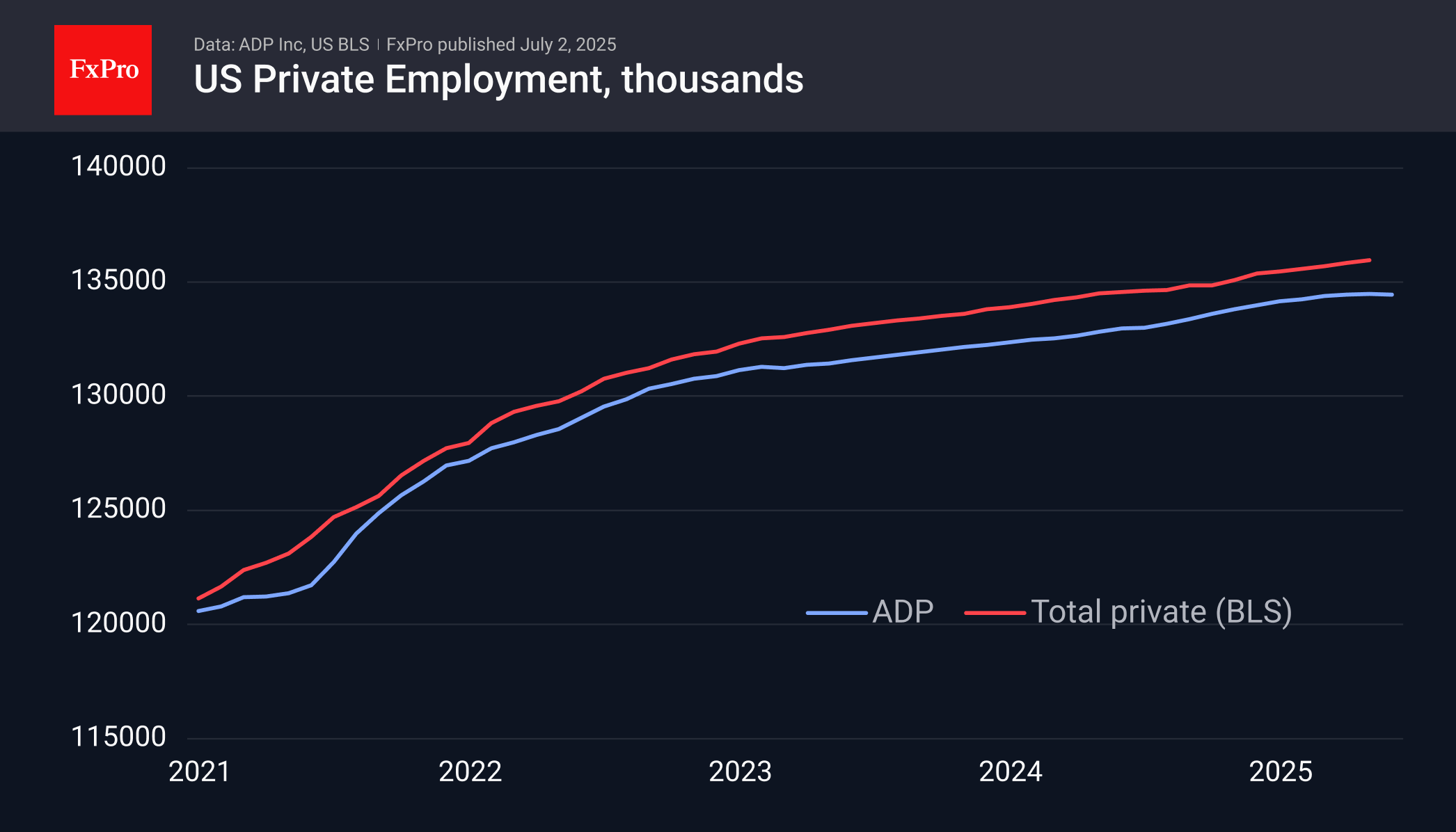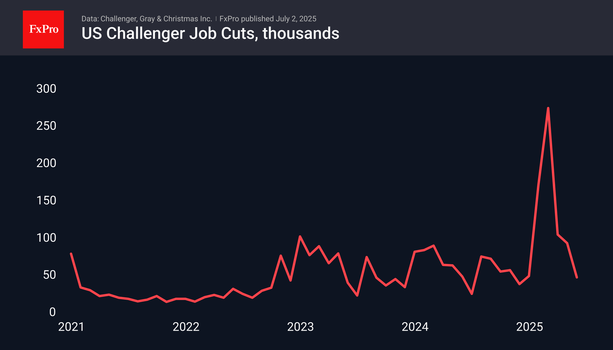 Данные ADP за июнь показали сокращение занятости в частном секторе США на 33 тыс. за июнь, что стало первым снижением с марта 2023. Однако, как и тогда, это может быть временный провал, так как индикатор планируемых сокращений показал снижение с почти 94 тыс. до 48 тыс. в прошлом месяце, что на 1.6% меньше, чем годом ранее. Пик плановых сокращений пришёлся на апрель, когда компании были шокированы тяжестью тарифов, но в последние месяцы ситуация стабилизировалась.