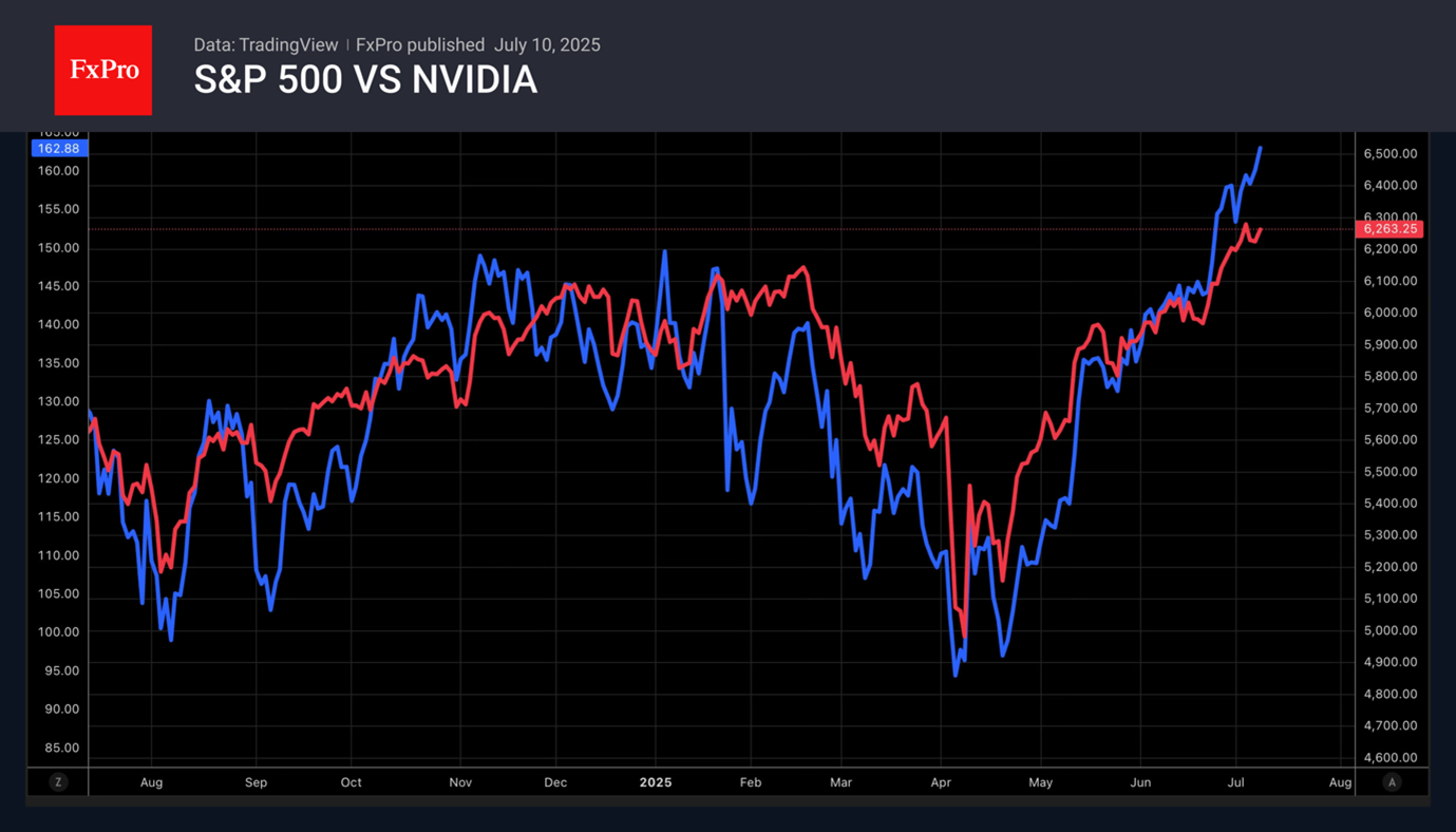 Во главе ралли рынка акций стоят технологические корпорации. NVIDIA стала первой компанией в мире, чья капитализация превысила $4 трлн. С начала года ее бумаги выросли на 20%, с 2023 – на более чем 1000%. Это позволило Nasdaq Composite обновить рекордные максимумы. S&P 500 подошел к ним на расстояние вытянутой руки.