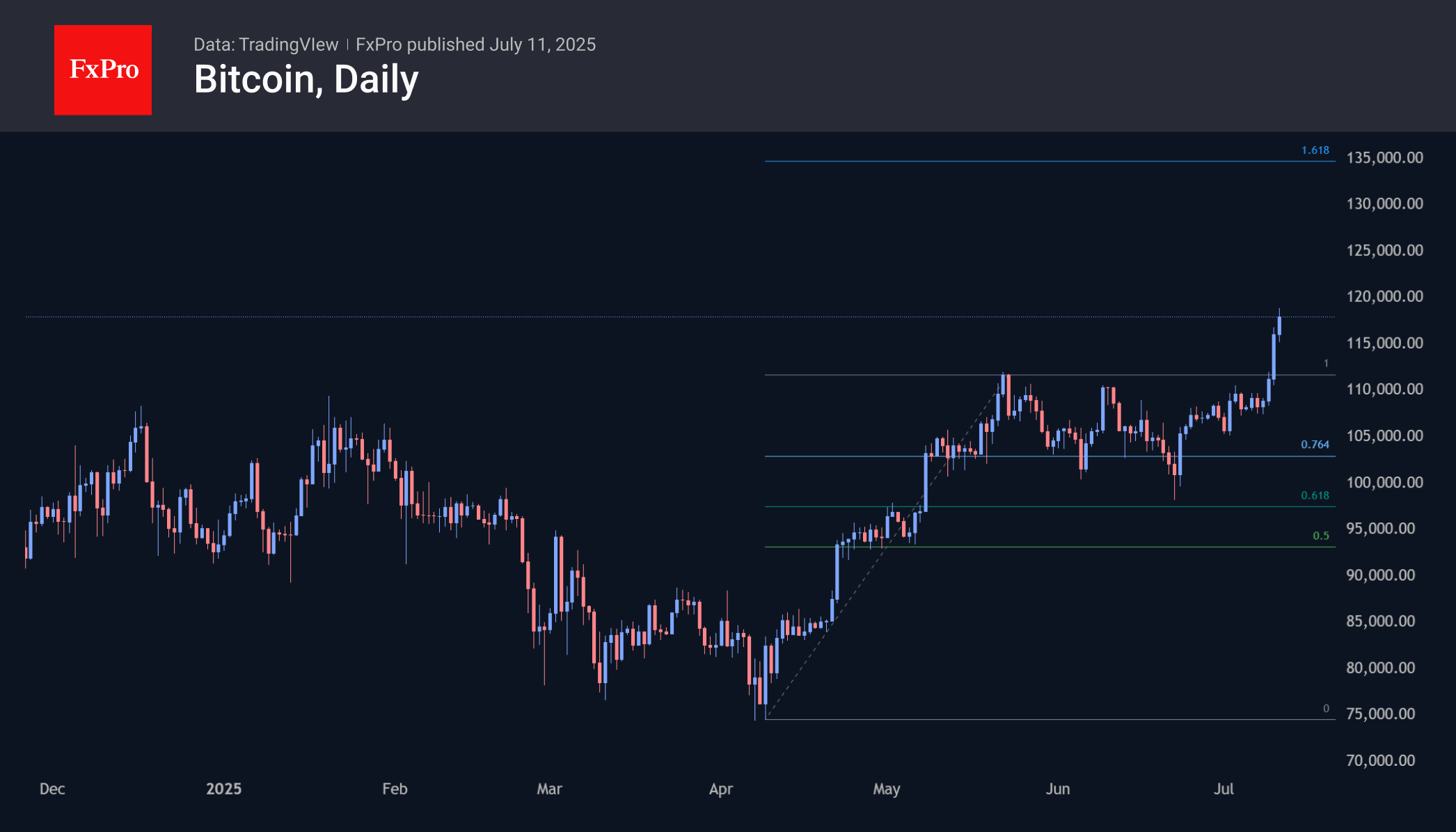 Биткойн впервые в истории превысил отметку 118000 благодаря притоку капитала в специализированные биржевые фонды и спрос со стороны накапливающих криптовалюту компаний. Поддержку BTCUSD оказало улучшение глобального аппетита к риску. Краткосрочно шансы «быков» по BTCUSD на продолжение ралли выглядят высокими, а техническая цель роста располагается выше 135 тыс. Глобальный аппетит к риску, а также спрос со стороны накапливающих криптовалюту компаний и ETF высок.