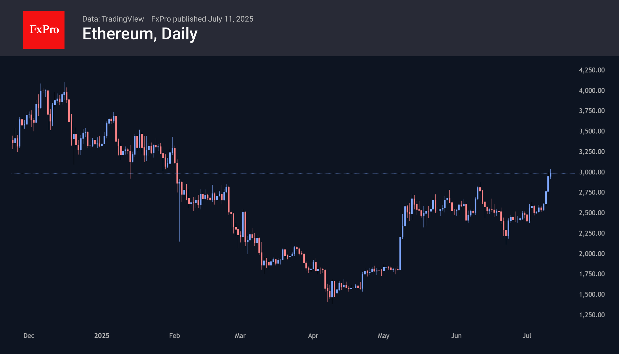Старые альткоины оживились в свете последних успехов первой криптовалюты. Ethereum в какой-то момент в пятницу утром превышал уровень $3000, выше которой в последний раз был в начале февраля. Если рассматривать его прошлую динамику в качестве дорожной карты, то следующими областями консолидации выглядят $3300 и $4000.