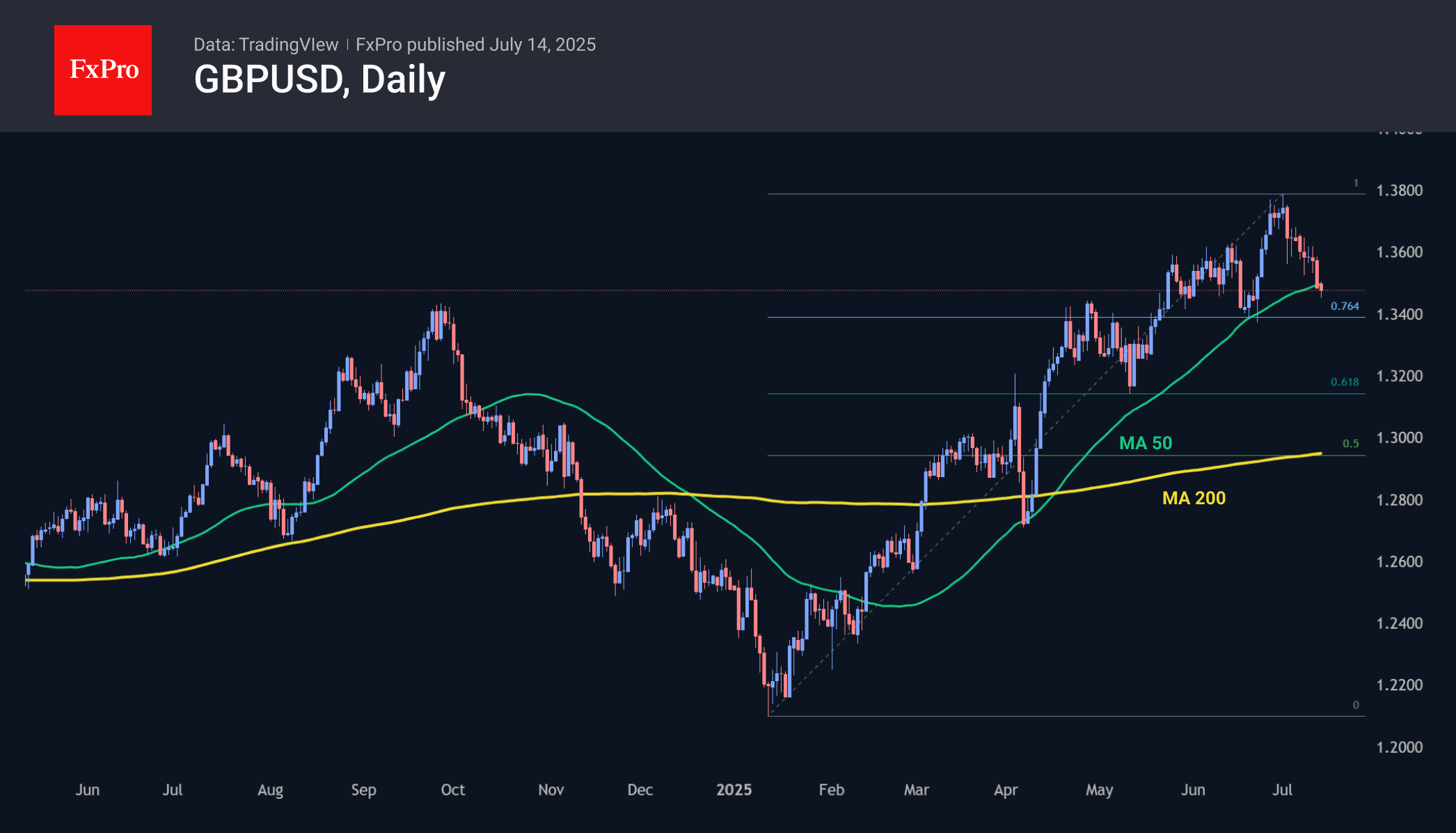Тенденция роста GBPUSD с начала года формирует тенденцию более высоких локальных минимумов и более высоких максимумов. В апреле мае и июне касание 50-дневной скользящей средней подстёгивало покупателей, останавливая локальную фиксацию прибыли.