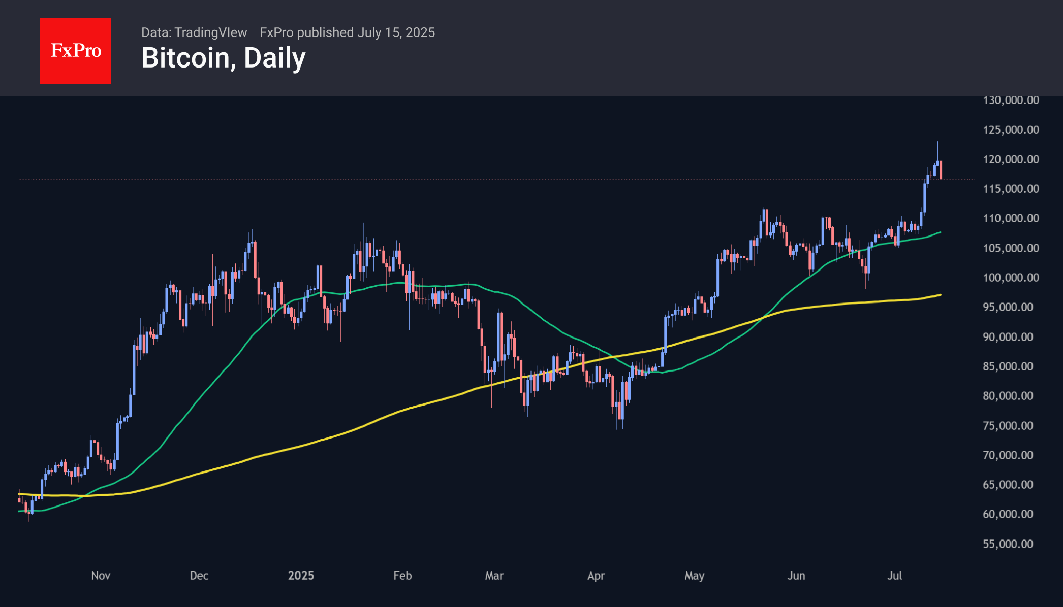 Биткоин оказался одной из главных жертв резкой фиксации прибыли, откатившись на 4% за 24 часа до $117K после установления рекорда на $123K. Это внушительно выше последнего пика на $112K, поэтому нет смысла говорить о развороте. В то же время мы получаем очередное подтверждение смены характера рынка с более частыми фиксациями прибыли. Нормой становится, что к продажам подключаются очень давние покупатели.