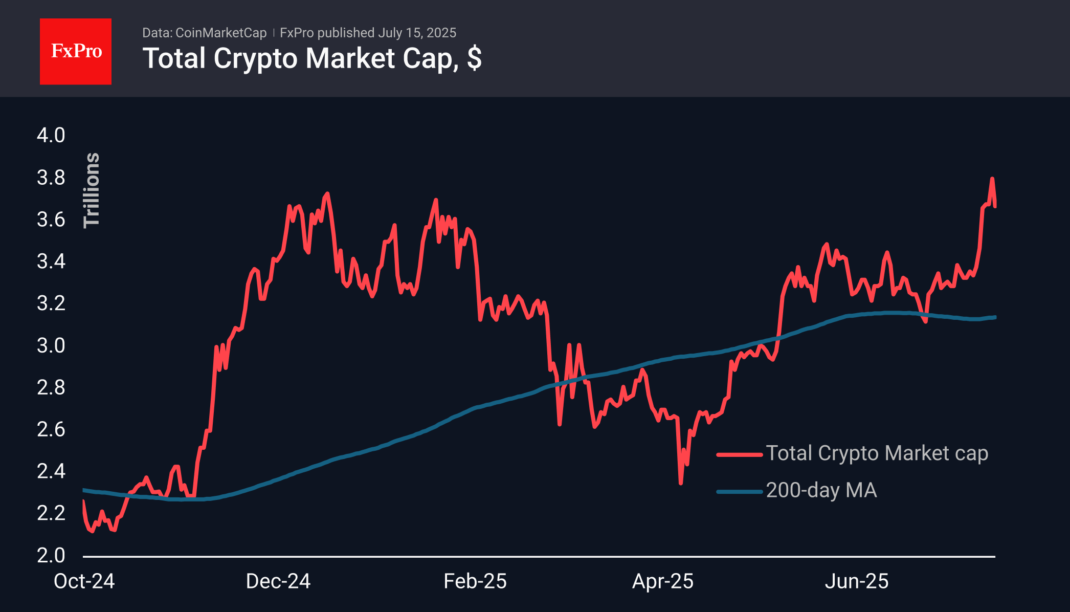 Капитализация крипторынка скорректировалась на 3.5% за день до $3.67 после резкого разворота Биткоина к снижению в разгар европейской сессии в понедельник. Примечательно, что фондовые индексы продолжили движение вверх, не подтверждая кардинальной смены аппетита к риску.