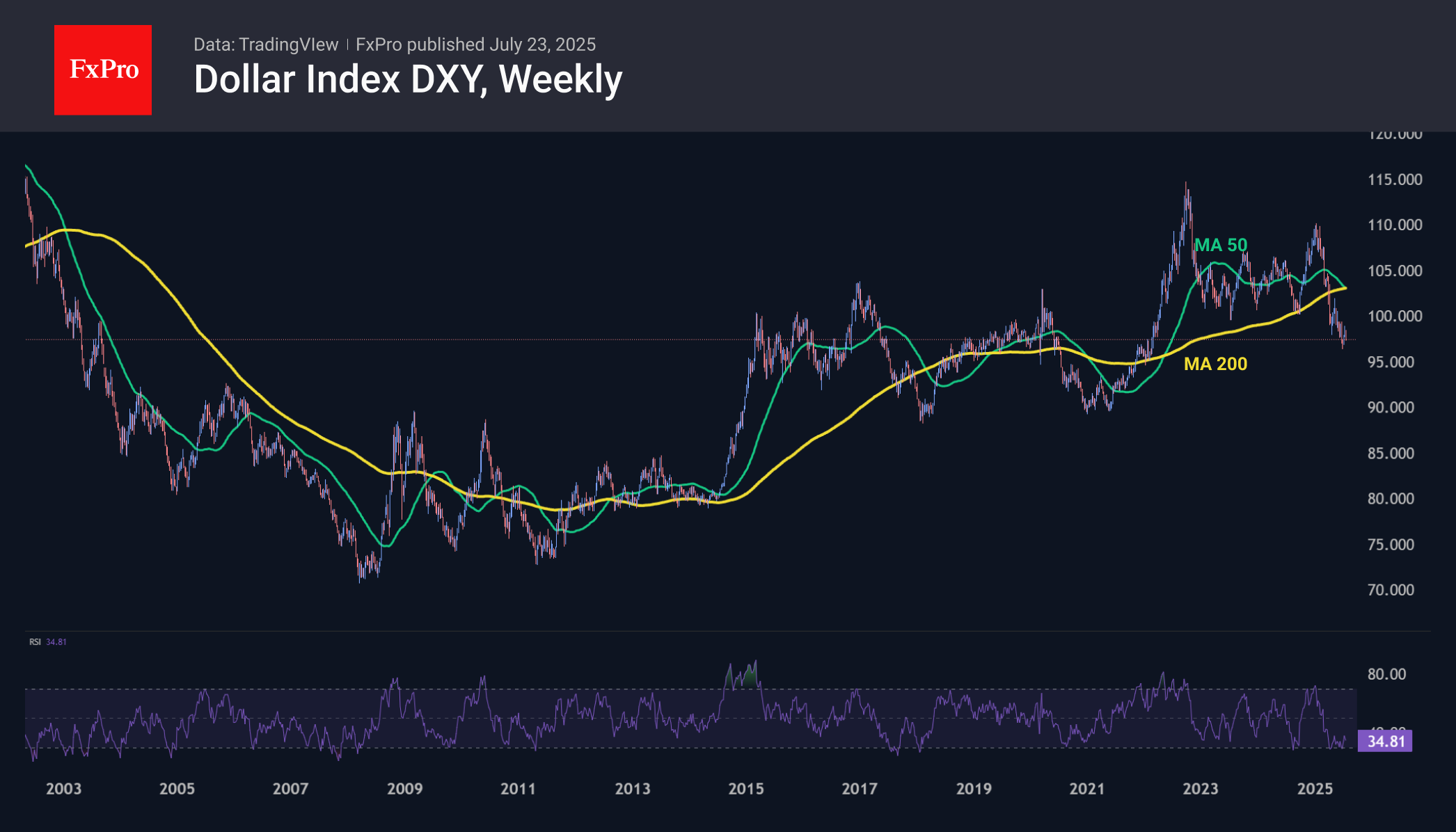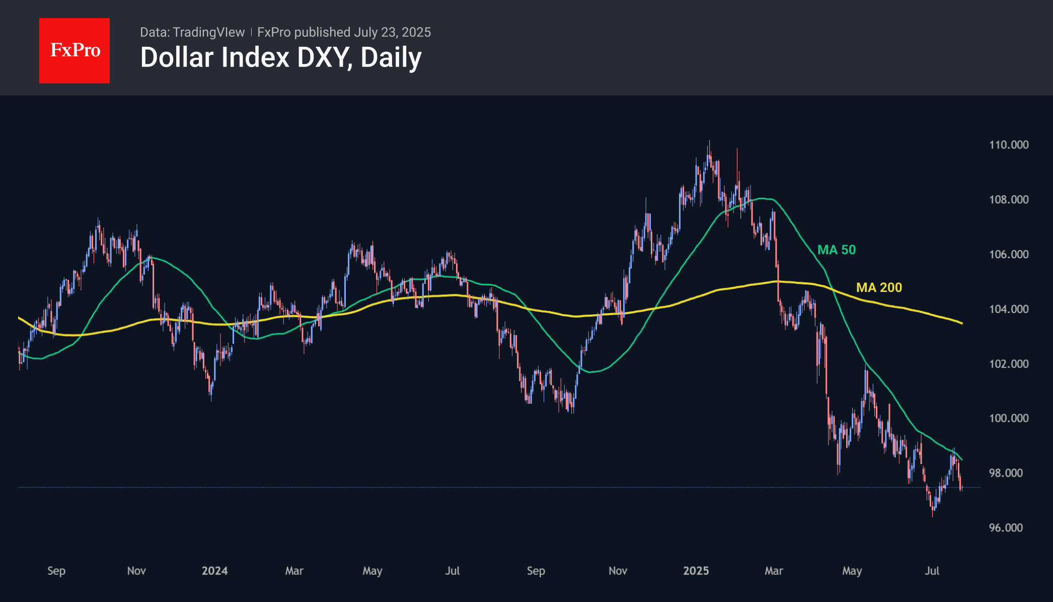 Индекс доллара под давлением с конца прошлой недели, откатившись к 97.2 после провала попытки закрепиться над 50-дневной средней и преодолеть поворотную область конца июня чуть ниже 99.0.