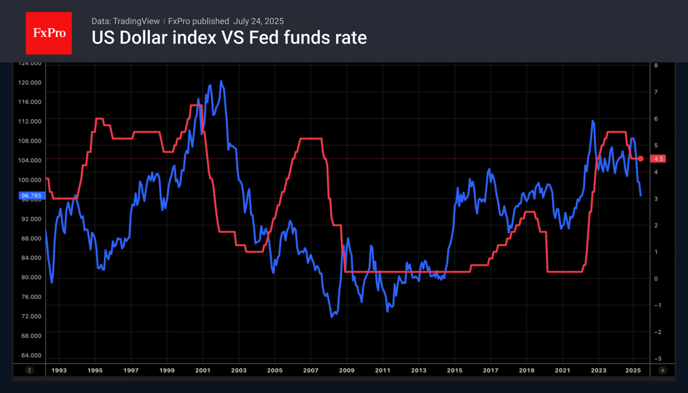 ДолларСША подписали соглашение с Японией, Индонезией и Филиппинами. Тарифы составили от 15% до 19%. Токио добился от Вашингтона снижения пошлин на импорт автомобилей с 25% до 15%. Глядя на эту сделку, Евросоюз также хочет получить 15%-е тарифы. Брюссель не намерен активировать механизм против принуждения и отвечать взаимными пошлинами на €100 млрд.Снижение рисков масштабной торговой войны США и ЕС увеличивает глобальный аппетит к риску и снижает тягу в тихие гавани. Одновременно снижение торговой неопределённости развязывает руки ФРС в деле ослабления денежно-кредитной политики. Резка ставки по федеральным фондам может случиться раньше, чем ожидалось. Это способствует падению USD.Срочный рынок рассчитывает на ускорение смягчения в 2026 из-за ухода Джерома Пауэлла с поста председателя ФРС. Новый глава центробанка будет избран Дональдом Трампом и наверняка станет прислушиваться к мнению президента США. Республиканец требует от Федрезерва снижения ставки на 300 б. п.