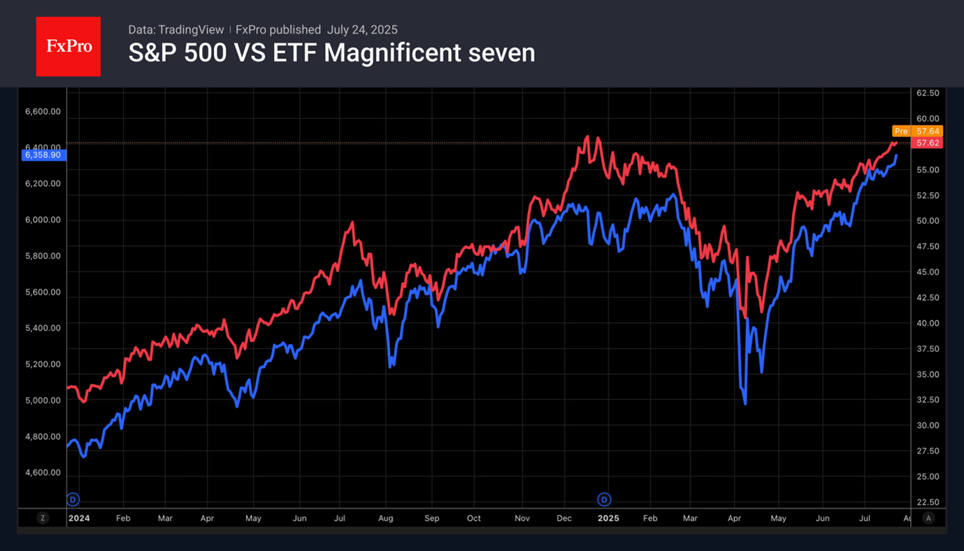 Фондовые индексыЭкономика США не падает с обрыва. Торговые сделки снижают неопределённость. ФРС двигается к ослаблению денежно-кредитной политики. Корпоративная отчётность радует глаз. Что ещё нужно фондовым индексам для ралли? S&P 500 не устаёт переписывать исторические максимумы и с нетерпением ждёт данных от Великолепной семёрки. Эксперты Уолл-стрит ожидают от её представителей 14%-ого роста прибыли по сравнению с 3% для остальных 493 компаний широкого фондового индекса.До сих пор фактические данные за второй квартал оказались лучше для 83% отчитавшихся эмитентов. Средний показатель за последние 5 и 10 лет составляет 78% и 75%, соответственно. Поддержку S&P 500 оказывает слабый доллар. В силу огромных масштабов внутреннего рынка США только 13% корпоративной прибыли поступает из-за рубежа. Входящие в состав широкого фондового индекса компании более интернациональны. Для Goldman Sachs, например, показатель составляет 28%.Долго ли продлится эйфория? Если из-за тарифов экономика США направится к стагфляции, доходы компаний упадут, а S&P 500 сделает шаг назад.Команда аналитиков FxPro