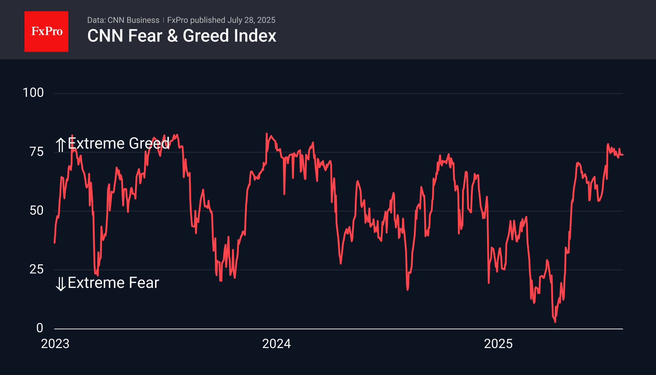 Индекс жадности и страха с первых дней июля курсирует у порога экстремальной жадности, периодически заступая на эту территорию. Утром в понедельник этот показатель находится на уровне 74. Из семи компонент индикатора волатильность VIX на нейтральной территории и соотношение пут и колл опционов в «жадности», в то время как остальные пять – в экстремальной жадности.