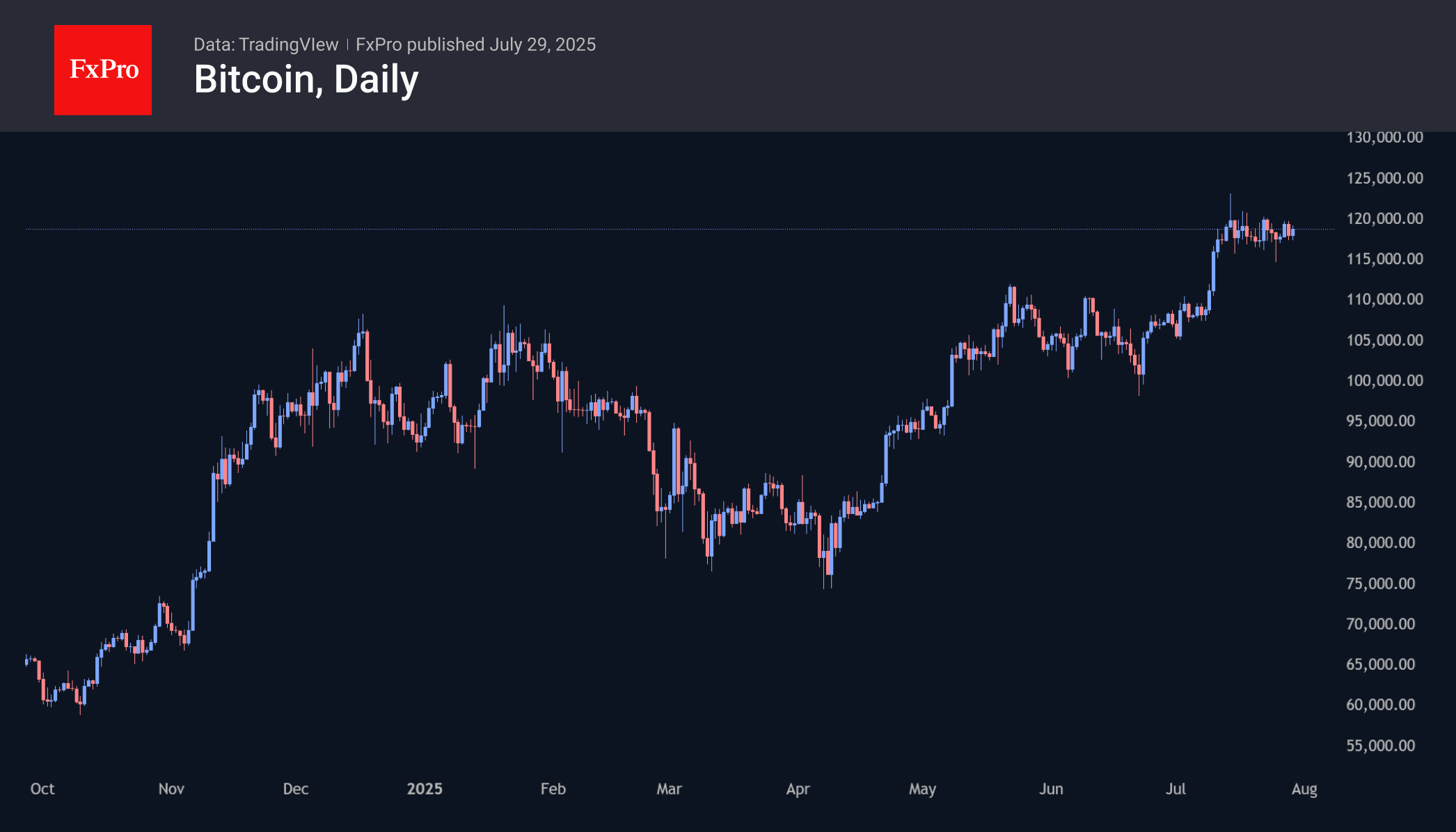 Биткоин торгуется вблизи $118.7K, так и не сумев пойти на штурм сопротивления у $120K. Эта нерешительность в выходе из диапазона скорей всего сохранится до момента, пока рынок не увидит решения по ключевой ставке ФРС в среду вечером.