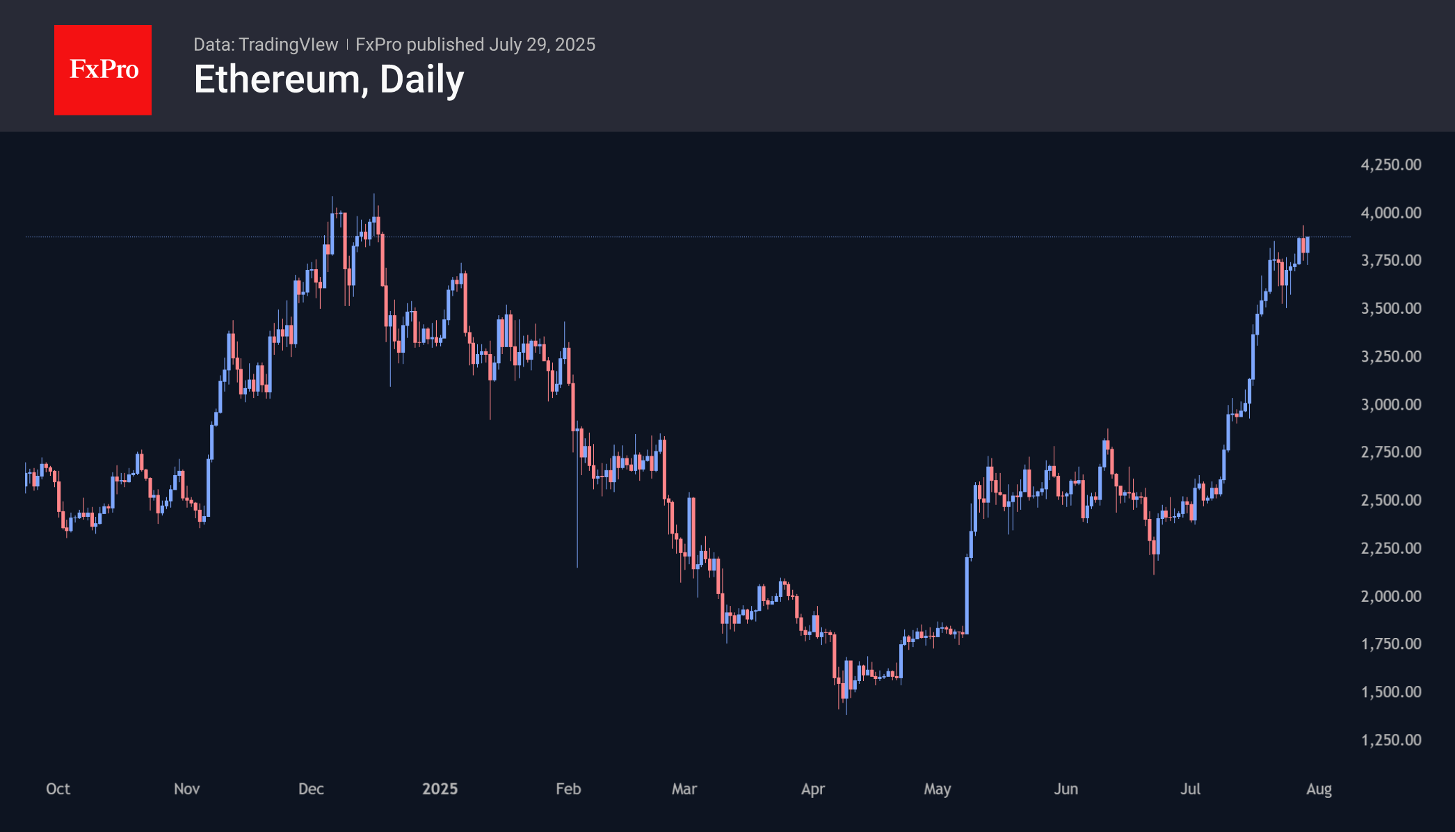 Ethereum поднимавшийся до $3930 в конце дня откатывался к $3700 в понедельник, где нащупал интерес новых покупателей и поднялся до $3830 на момент написания. Последние семь дней сформировался довольно резкий повышательный тренд, сохранение этой тенденции забросит цену выше 4000 до конца этой недели.
