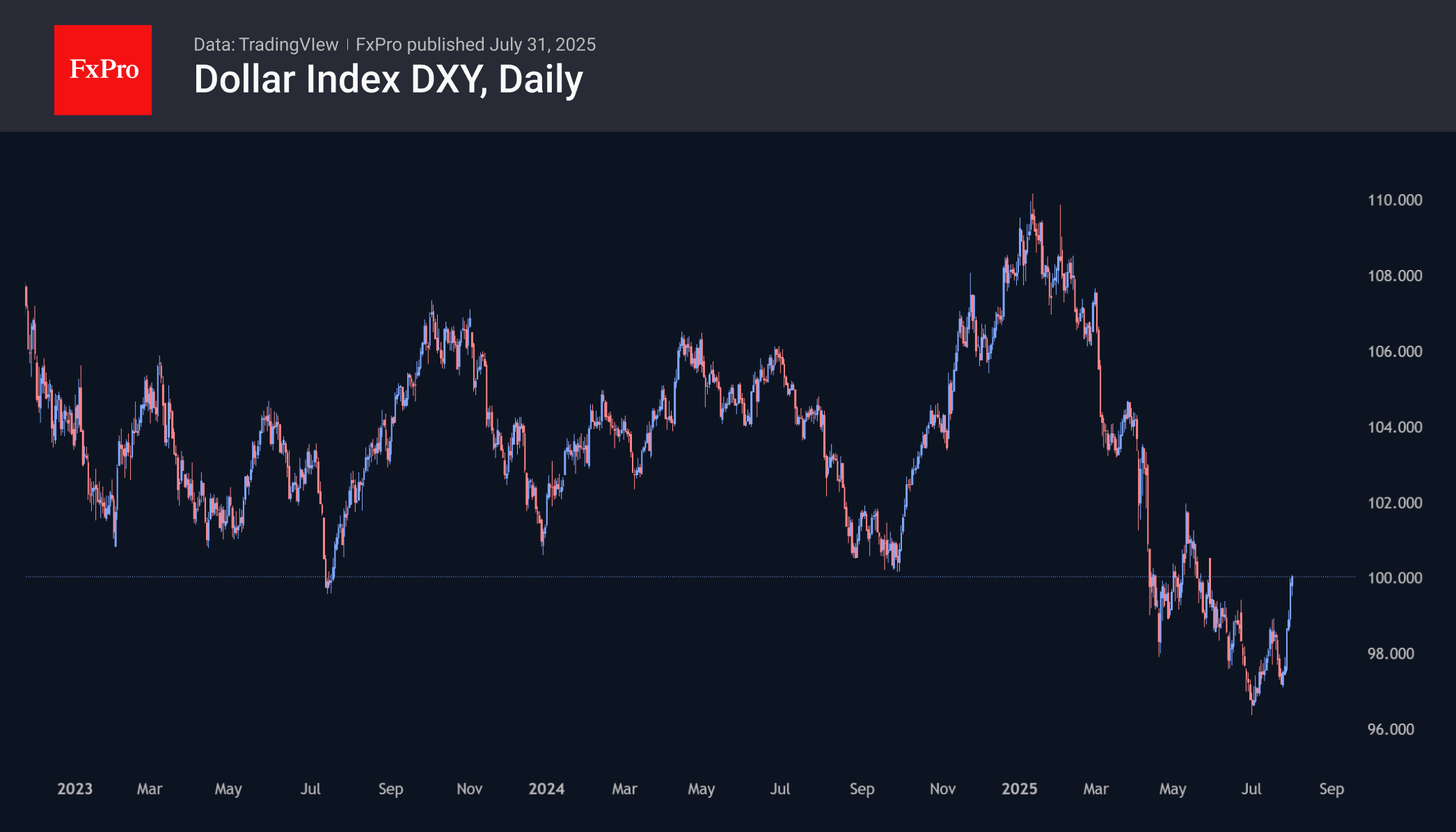 Указанный сдвиг довёл внутридневной рост индекса доллара до 1% в среду. В четверг его укрепление продолжилось после непродолжительной перетряски, доведя DXY до максимумов с конца мая. Доллар подходит к психологически важному круглому уровню 100, который в предыдущие два года обеспечивал поддержку, но не выдержал тарифных войн ранее в этом году.