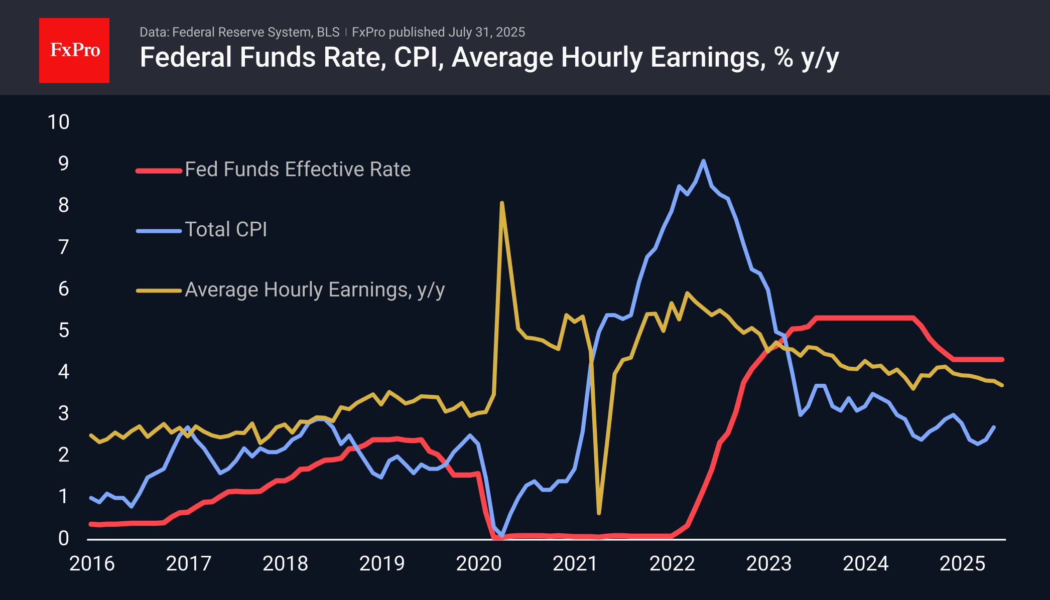 В результате рынок сократил до всего лишь 45% шансы снижения ставки в сентябре против 95% месяцем ранее и 60% неделей ранее. Ожидания на конец года также ужесточились, балансируя между прогнозами на 1–2 понижения против 2–3 ранее и давая 15% вероятность на сохранение ключевой ставки.