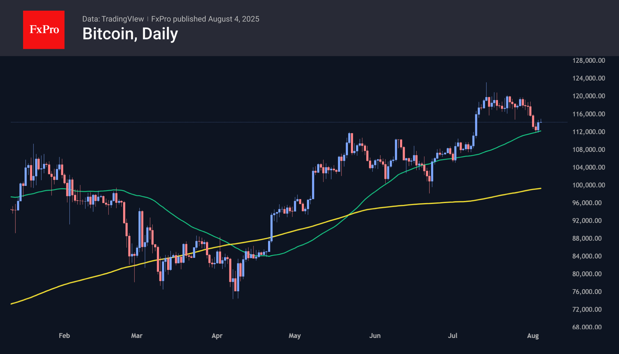 Биткоин в субботу и воскресенье получал поддержку покупателей на спадах ниже $112K вблизи 50-дневной скользящей средней. Это четвёртое касание данной кривой с апреля. На настроениях «buy the dip» первая криптовалюта восстанавливалась в понедельник утром до $115K. Отскок от поддержки – это бычий сигнал на ближайшую пару дней, но факт участившегося её тестирования вызывает насторожённость на среднесрочную перспективу.